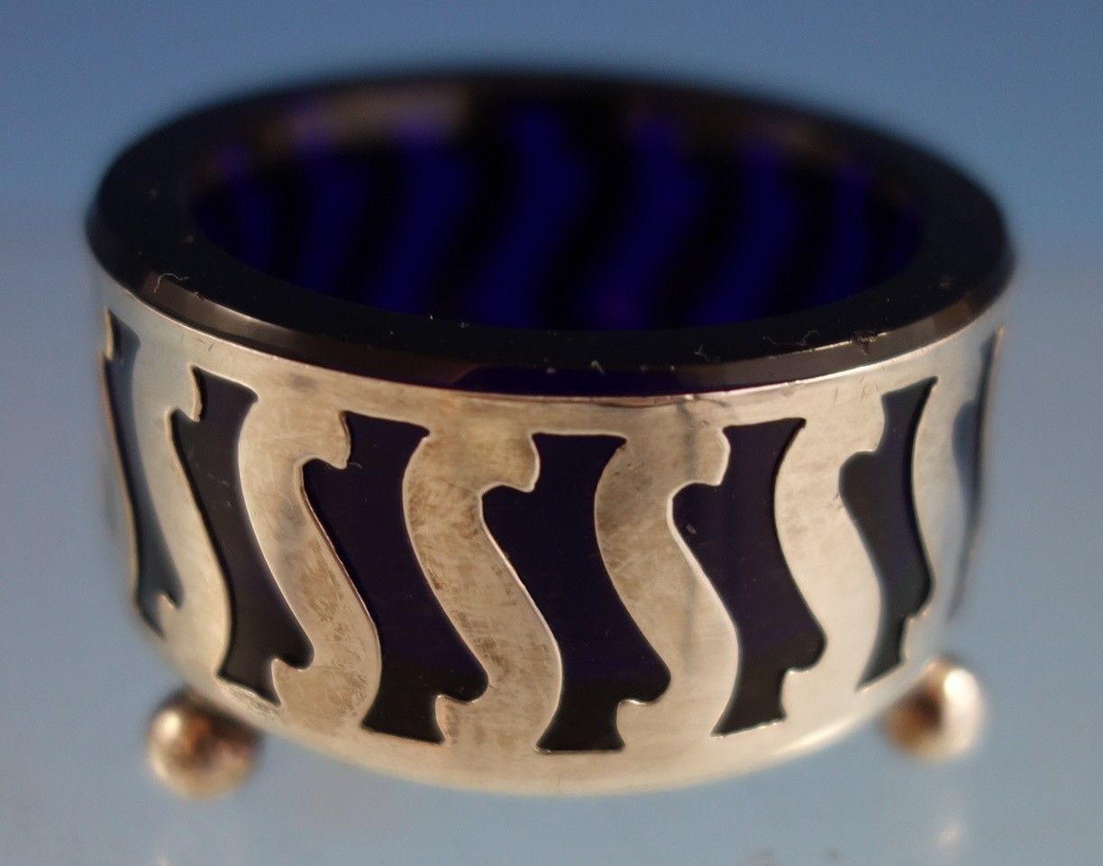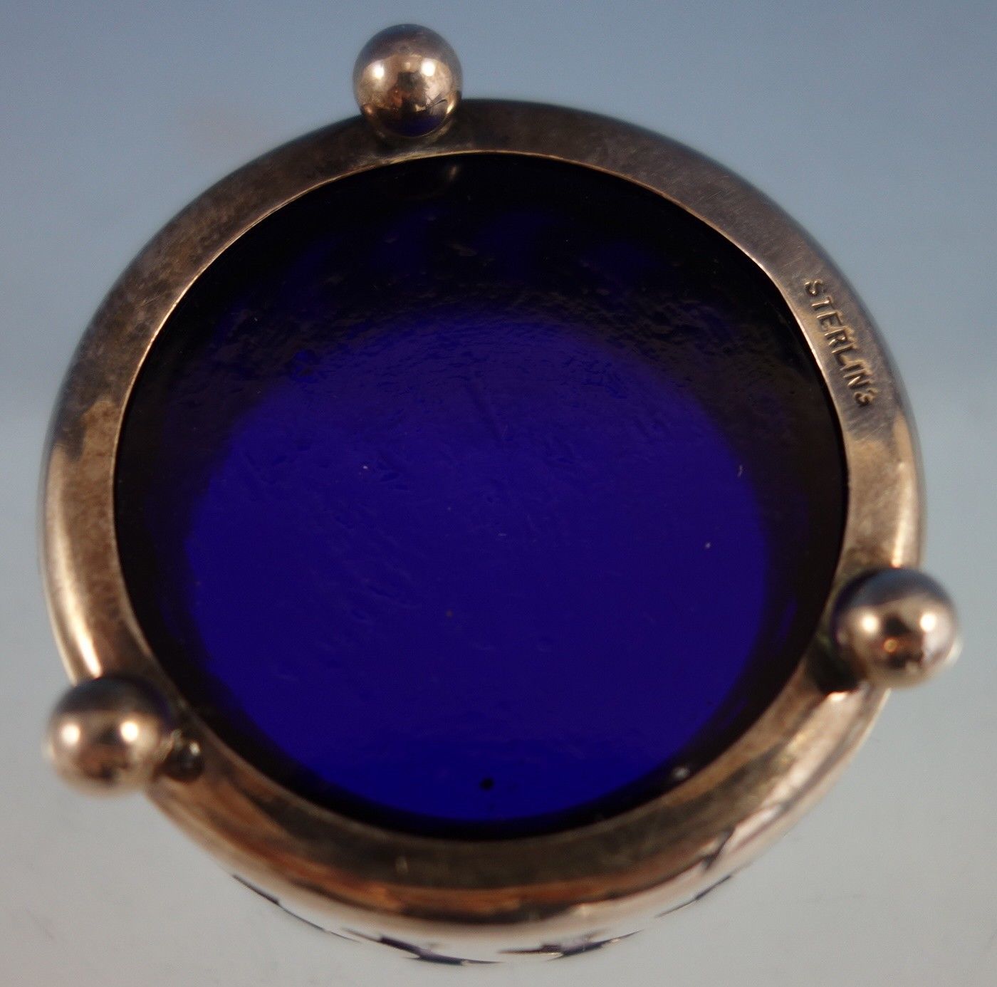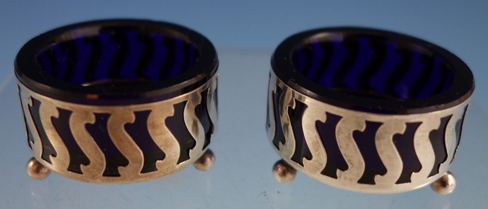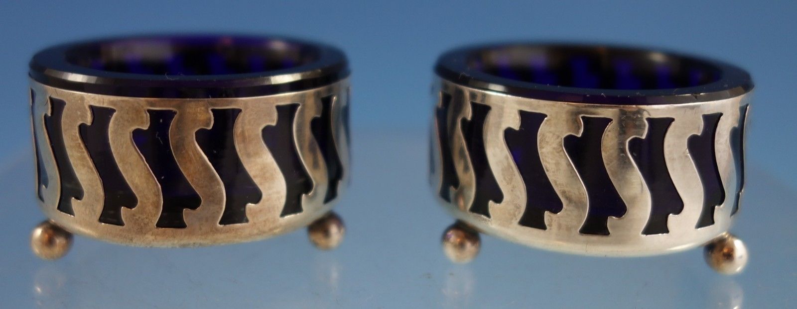 Wonderful sterling silver pierced salt dip pair with beautiful cobalt glass liners. The pieces measure 1 1/2" x 3/4". This set is not monogrammed and is in excellent condition. Gorgeous!