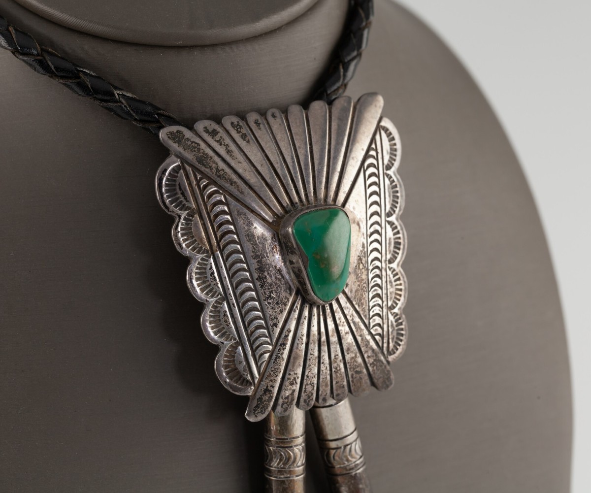 Sterling Silver Turquoise Bolo Tie with Stranded Leather Strap and silver Aglets