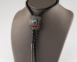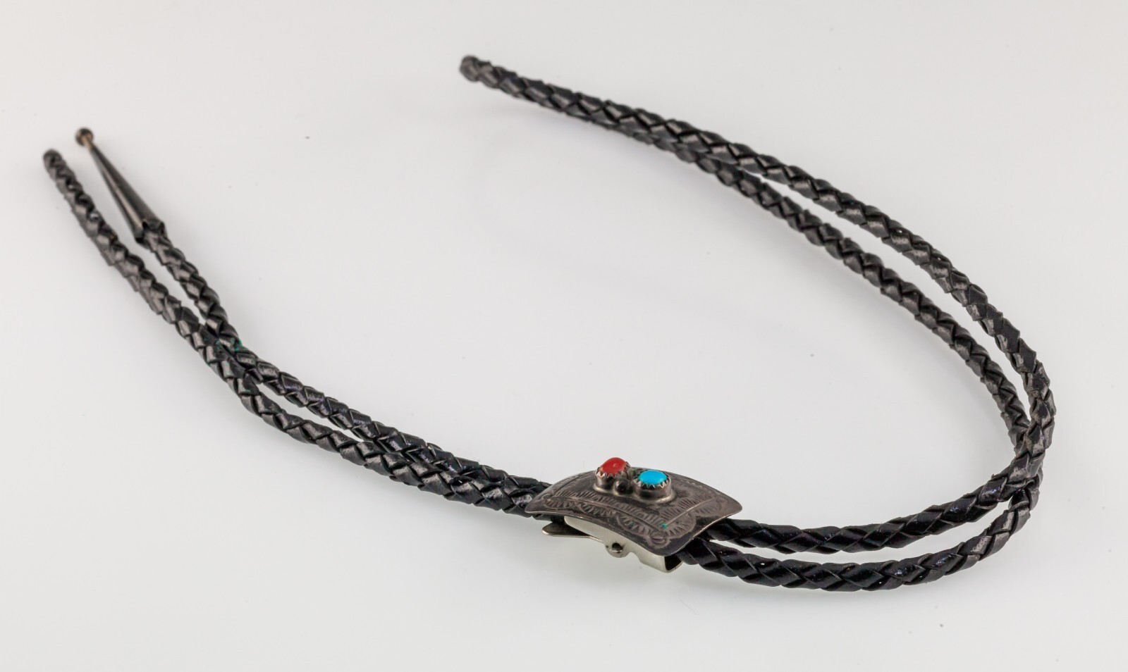 - Sterling Silver Turquoise and Coral Braided Leather Bolo Tie