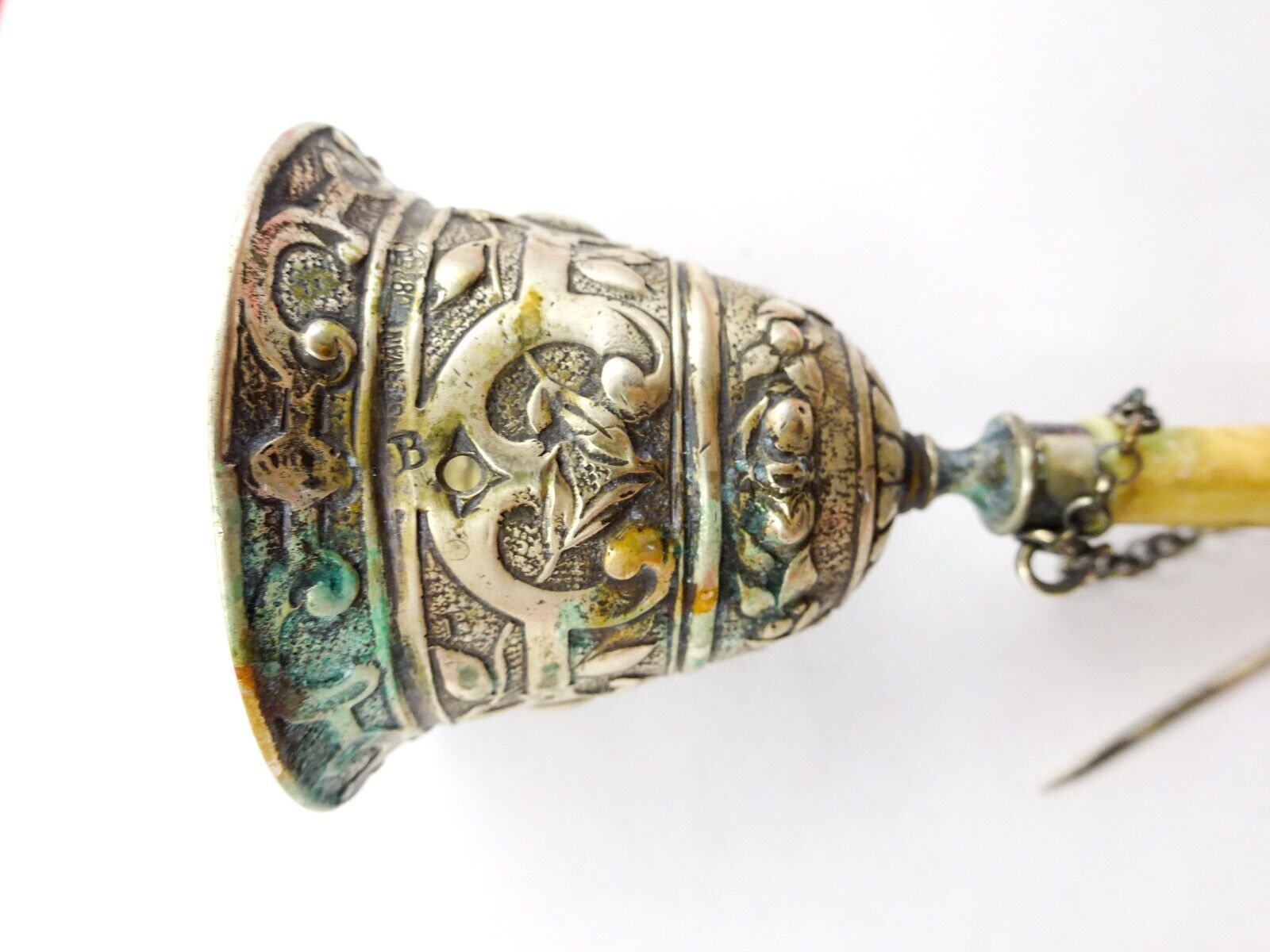 Wonderful sterling tussie mussie with cast cup featuring bows and swags. The carved bone handle has some discoloration. Attached pin and ring. It measures 4 7/8" tall and 1 7/8" diameter. It dates from the 1920's. Terrific!