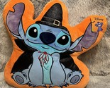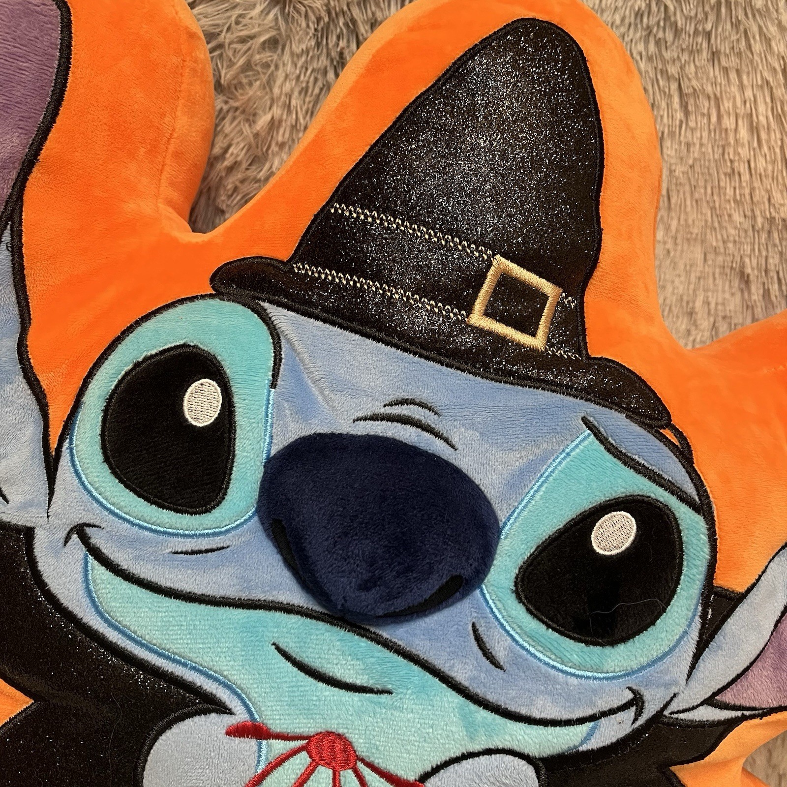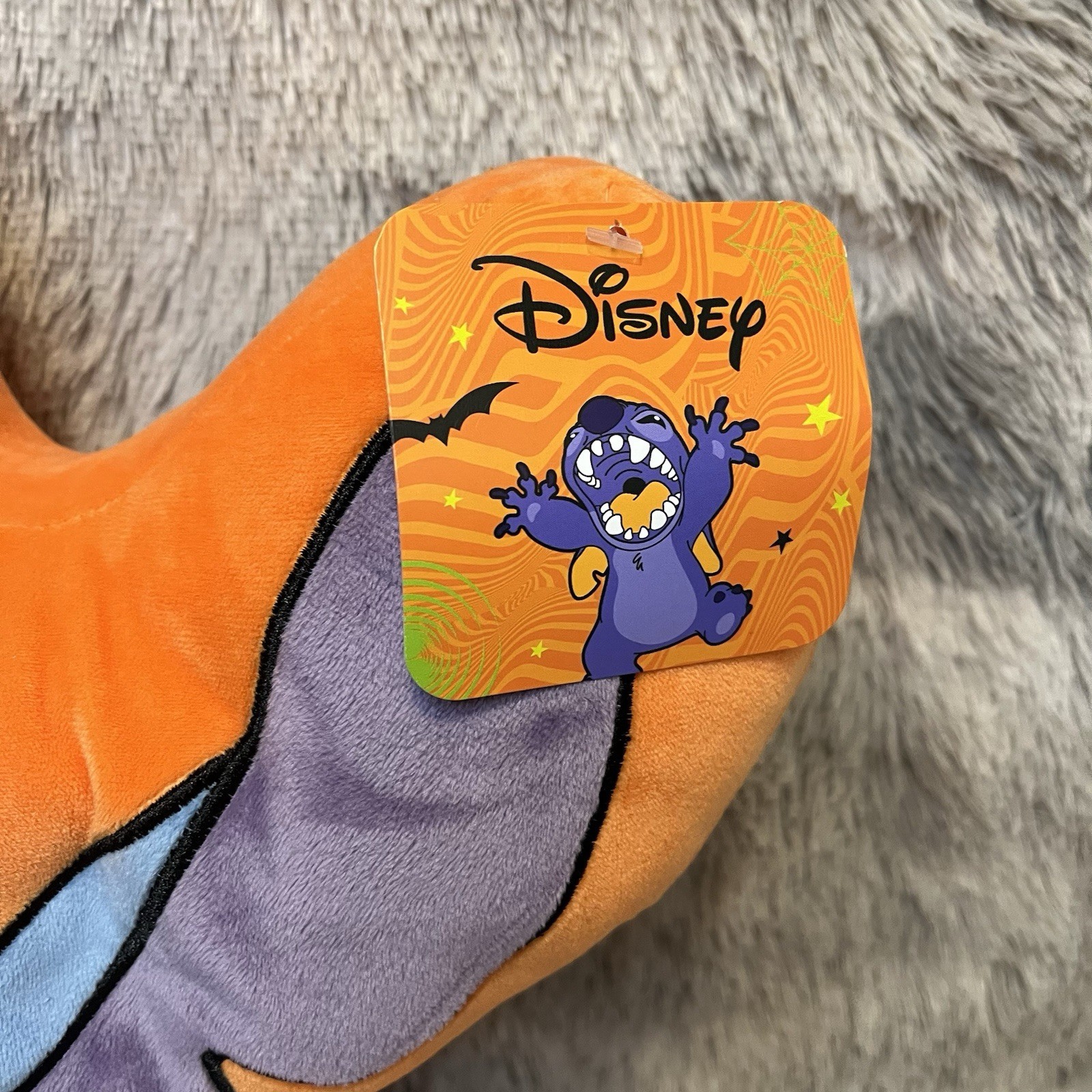 Adorable Disney Stitch plush with Halloween theme. Features vibrant orange and blue colors. Stitch wears a black witch hat and cape.