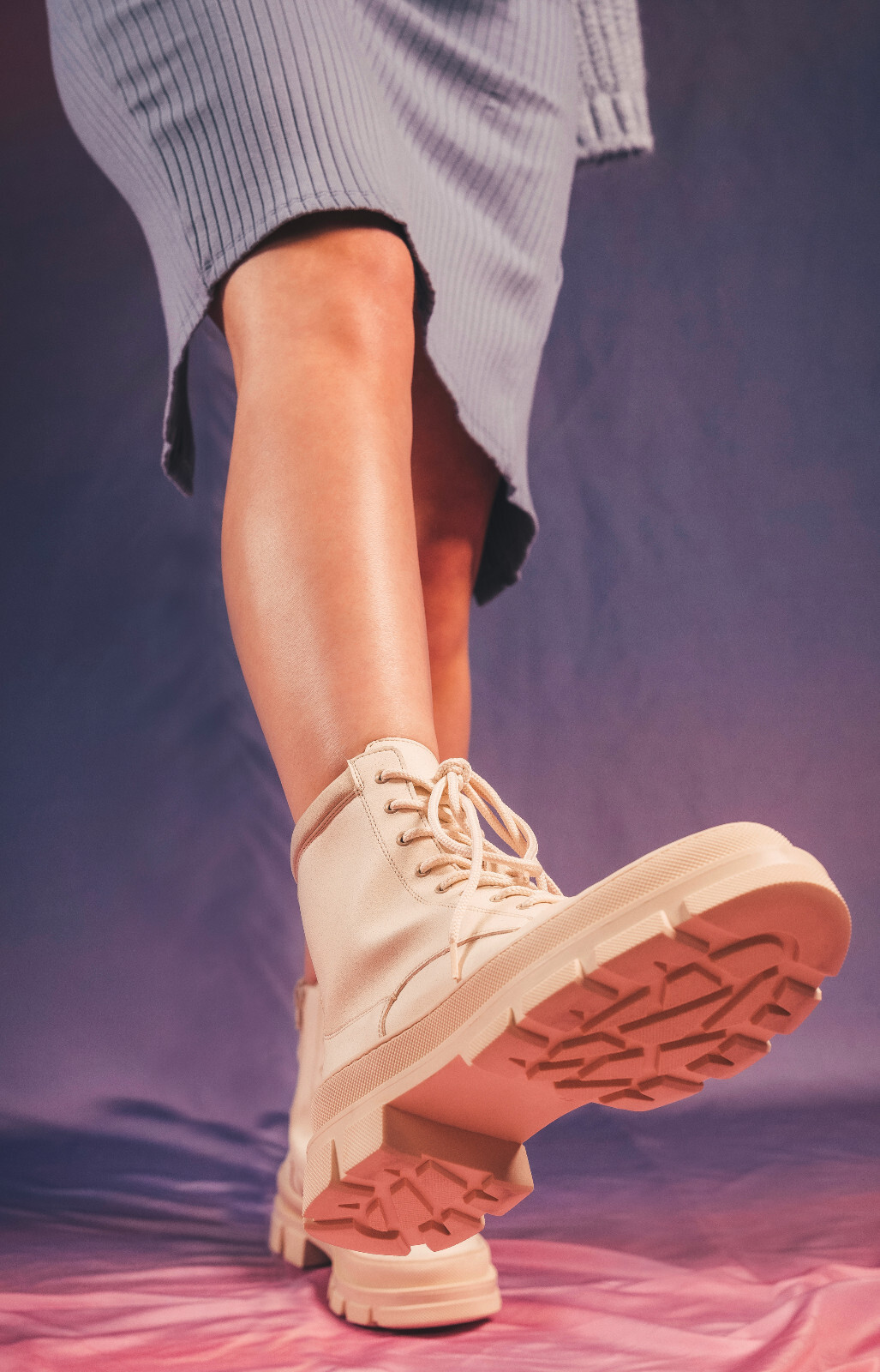 una spessa suola beige e da un collo imbottito dello stesso colore.
