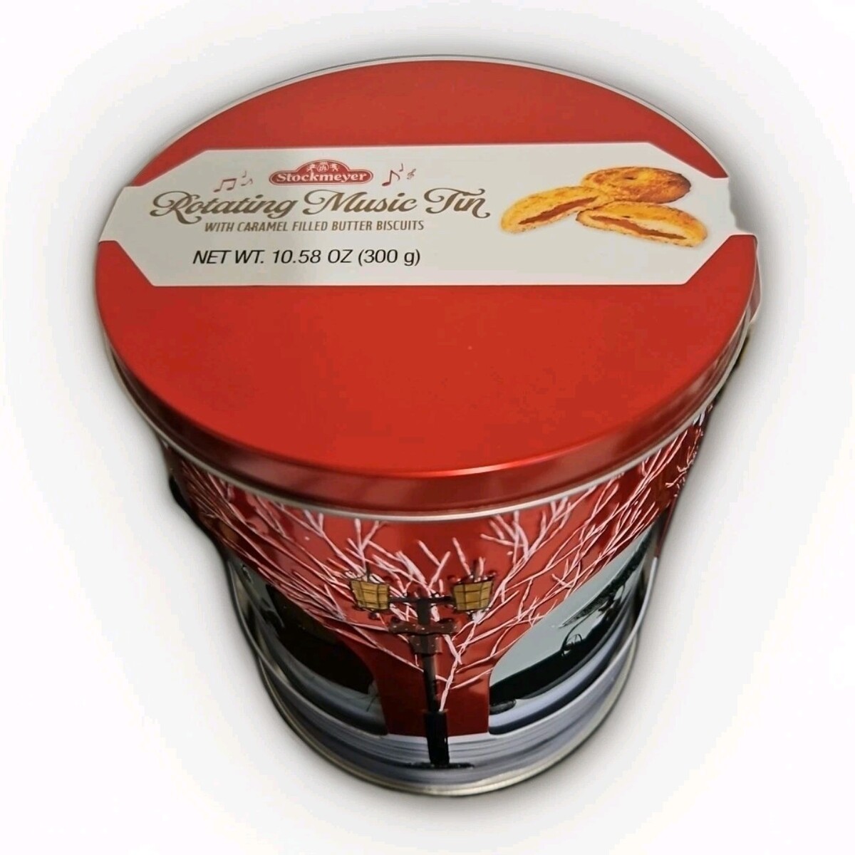 - Stockmeyer Christmas Rotating Music Tin With Caramel Filled Butter Biscuits Red