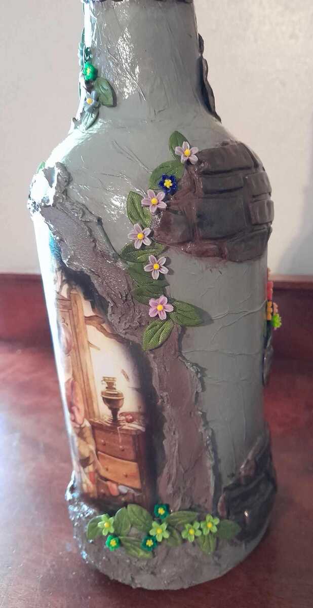 I took a large glass bottle and incorporated a decal and adorned it with texture paste, clay brick, resin flowers and satin leaves.