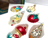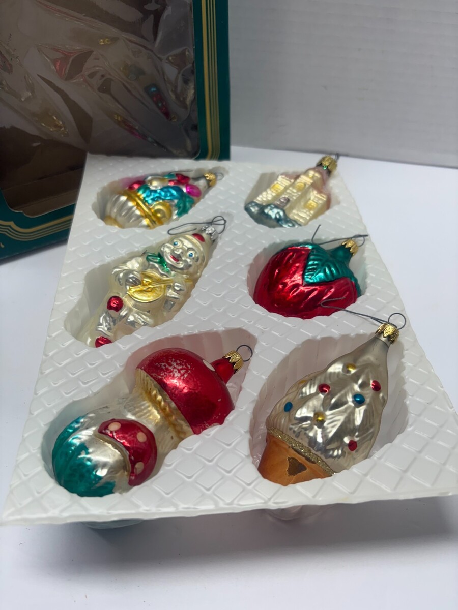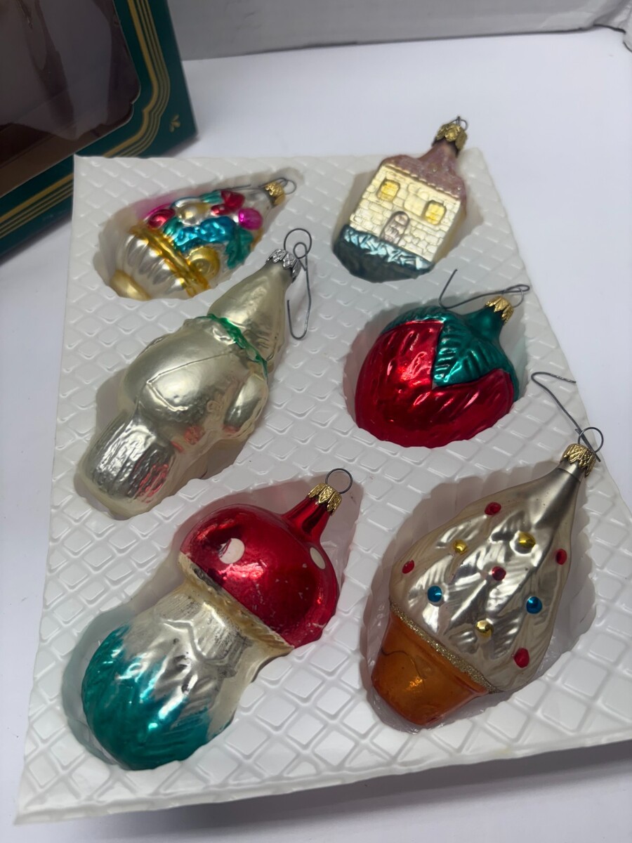 This set of 6 vintage glass ornaments is pre-owned/used. Boxx has wear and the ornaments are in solid, vintage condition. Approx 4" tall each.