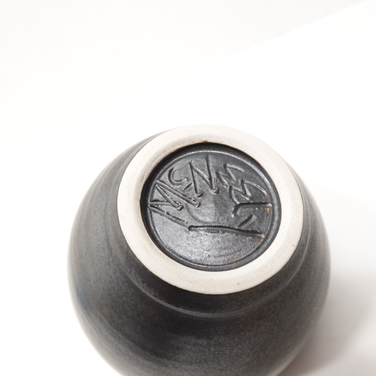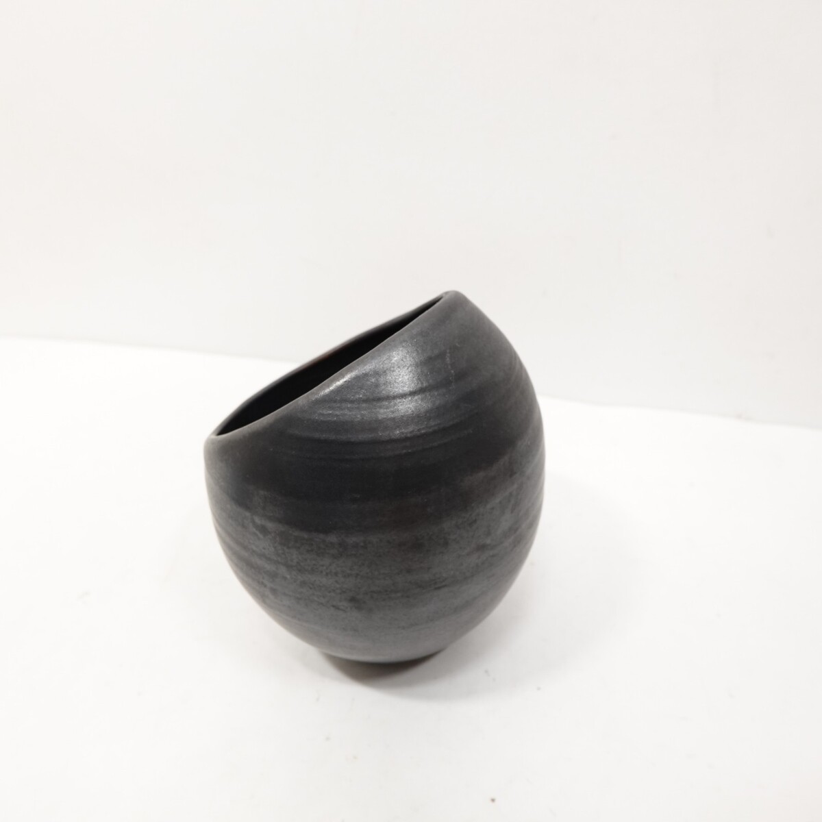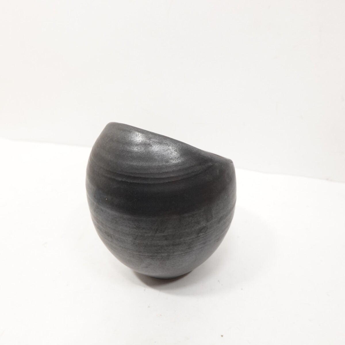 Beautiful hand-thrown studio pottery vase signed M. Swan. Features a striking asymmetrical rounded form with a slanted lip and a satin matte black glaze. This minimalist design showcases subtle wheel-thrown lines and a smooth finish ? a fine example of modern artisan craftsmanship.