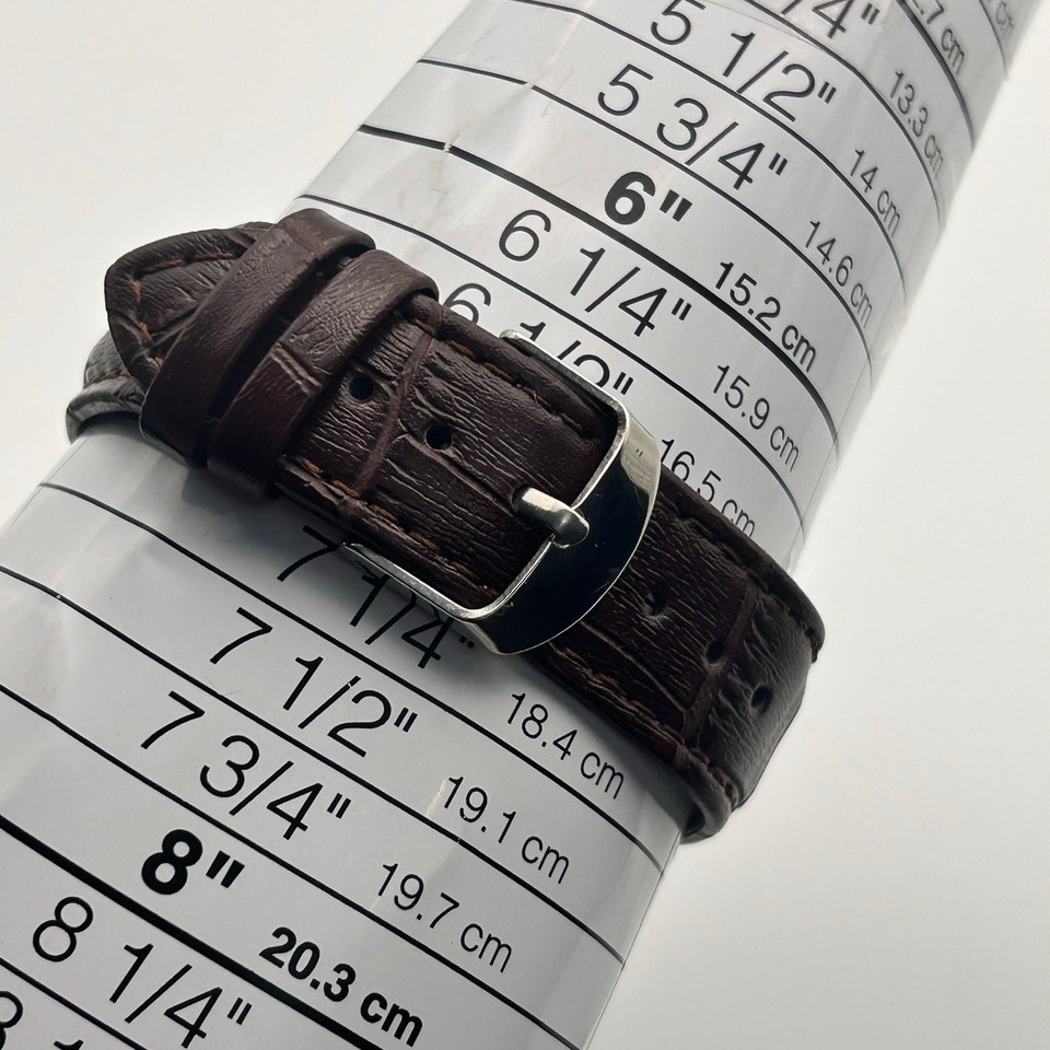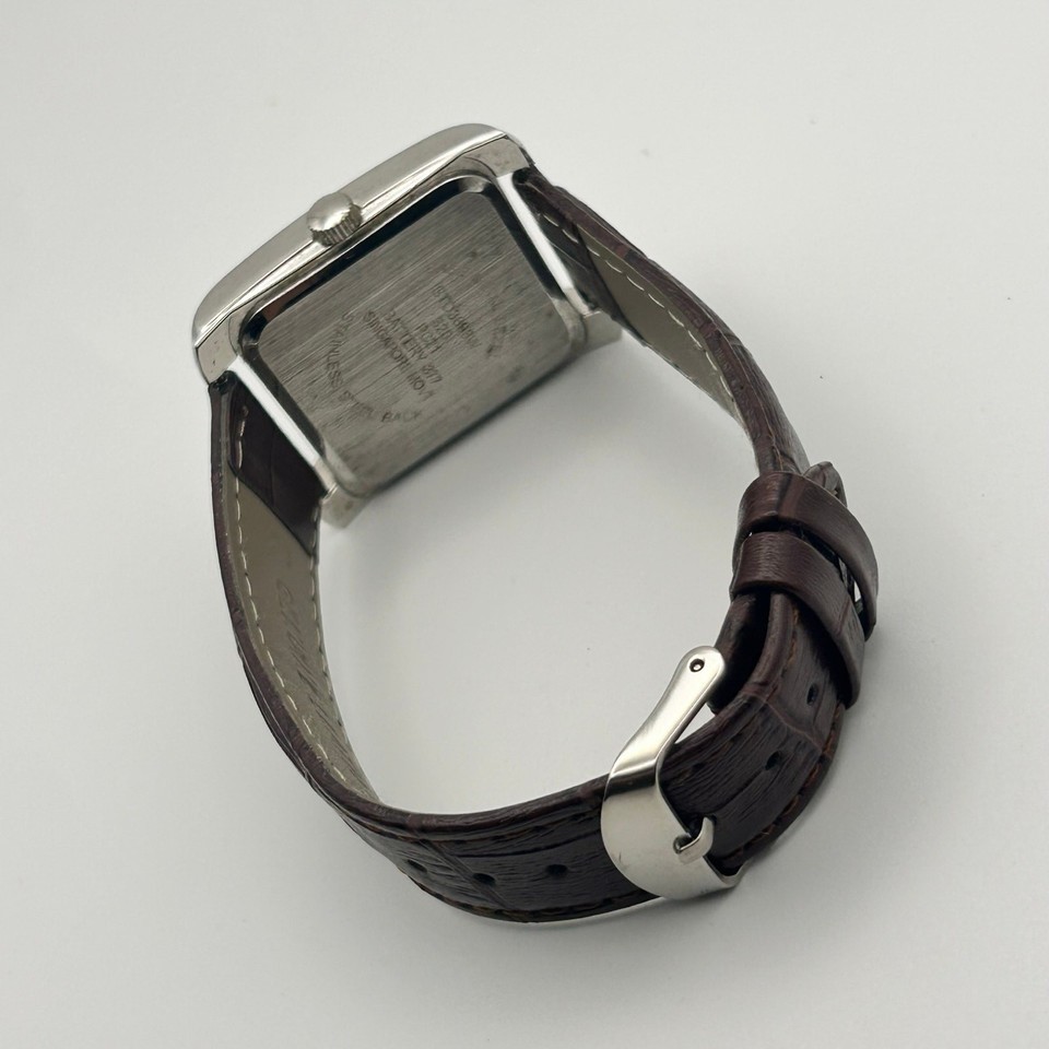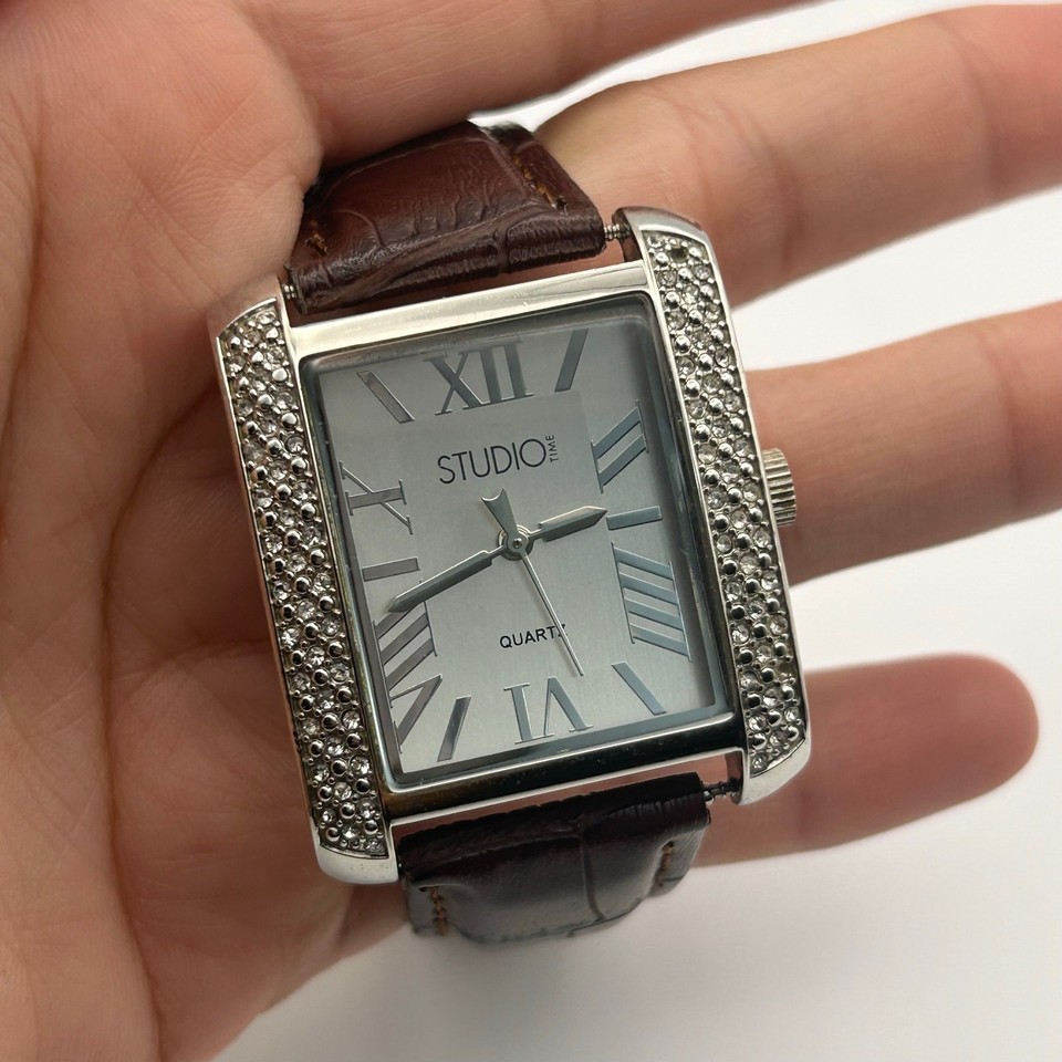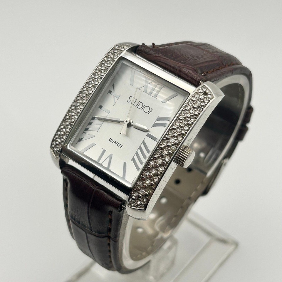 This is a beautiful Studio women's wristwatch! The watch features a sleek silver stainless steel case and a stylish brown leather strap. The watch face measures 32mm in diameter.