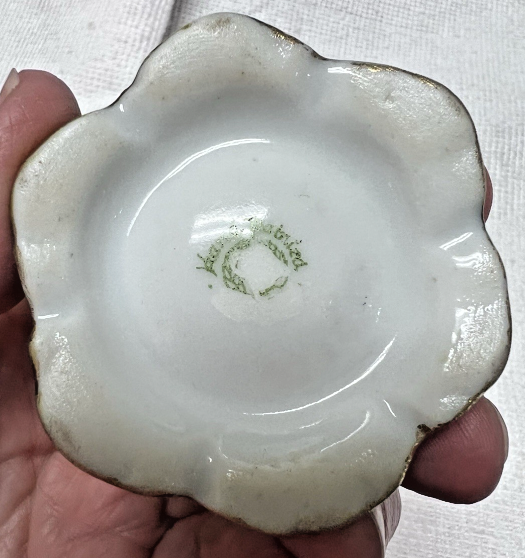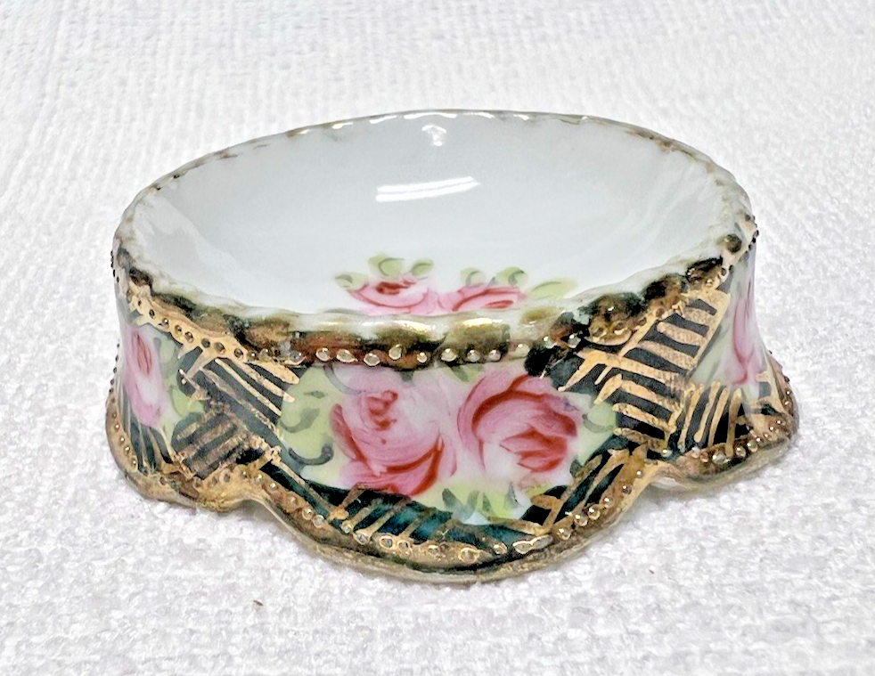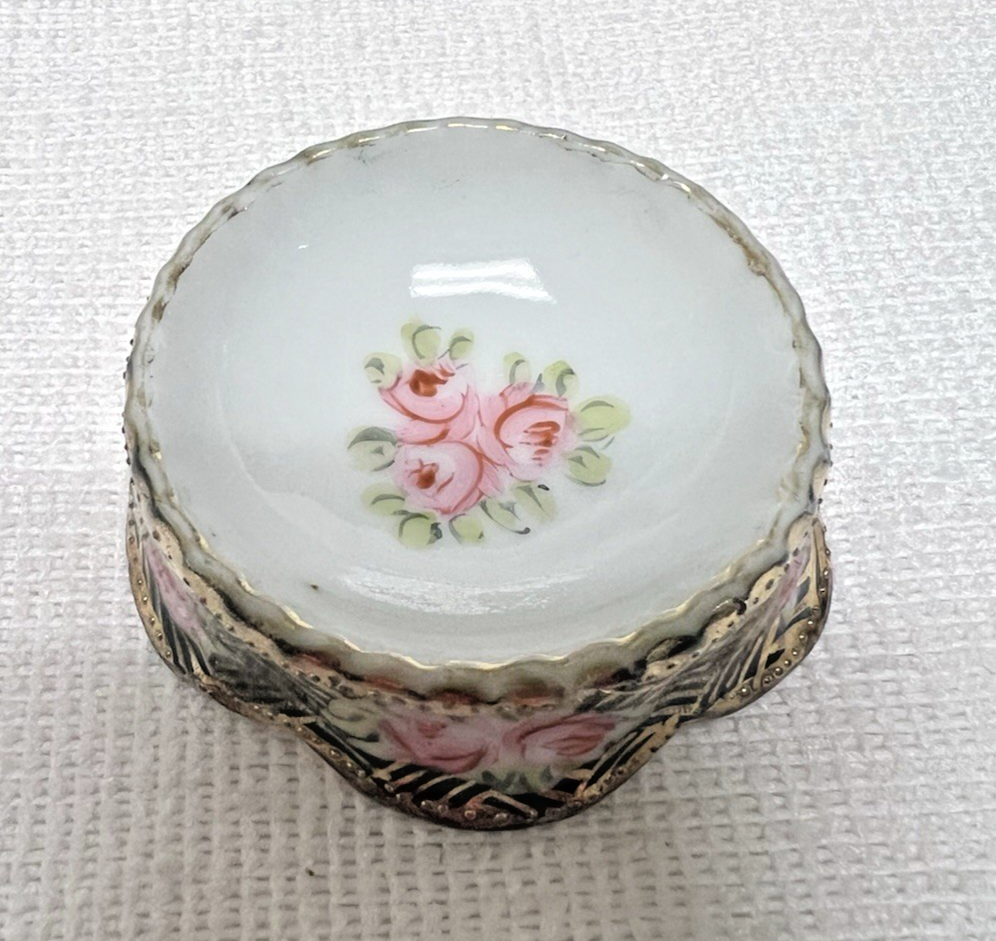 - Stunning Pink Roses on Green w GOLD Hand Painted Salt Dip 2 1/4 W x 5/8 T