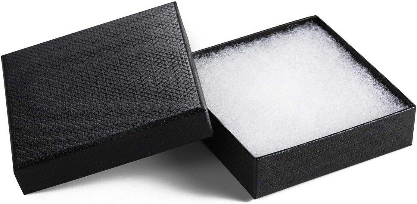 Discover our versatile Small Multi-use Gift Boxes, measuring 3.5x3.5x1 inches in sleek black. Perfect for jewelry, collectibles, coins, and small gifts, these sturdy boxes are crafted from high-quality embossed black cardboard and cushioned with soft cotton fill to protect delicate items from scratches and impacts during storage or transit.