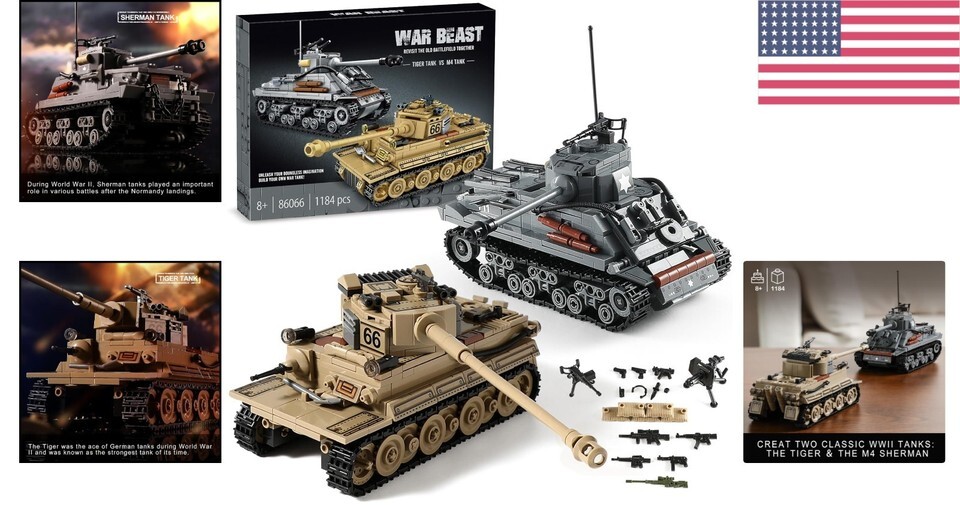 Build two iconic WWII army tanks - the German Tiger and the U.S. M4 Sherman