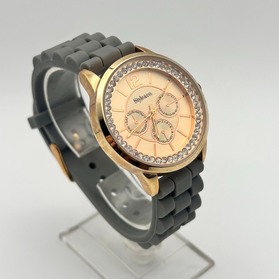 - Style & Co Rose Gold Crystals Gray Silicon Band 37mm Women’s Watch Working