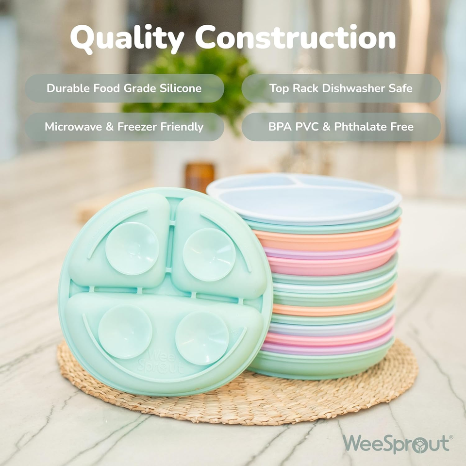 ? MESS-FREE SUCTION PLATES FOR TODDLERS - Voted Best Baby Suction Plate by The Bump in 2023, this set of 3 WeeSprout silicone suction plates with lids encourage independent eating without the mess. Place your suction plate on any flat surface for an extra secure grip that won?t budge. And each plate comes with a lid to store leftovers for later.