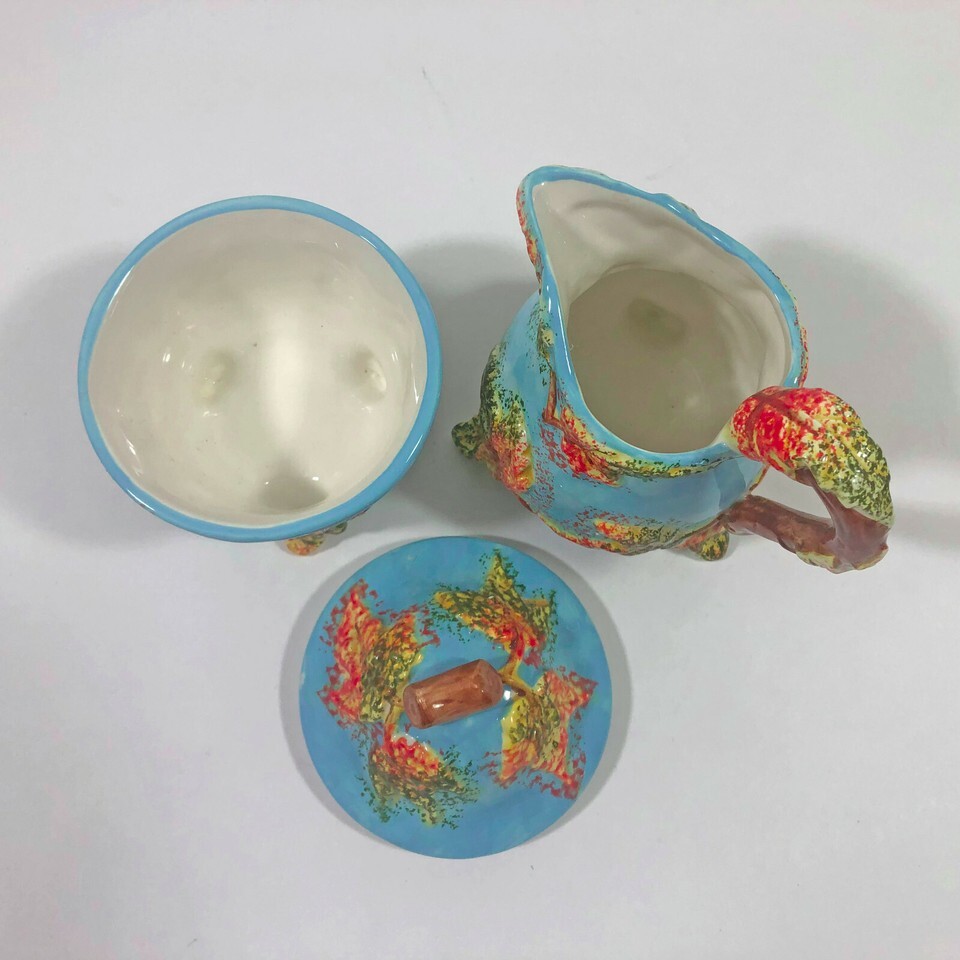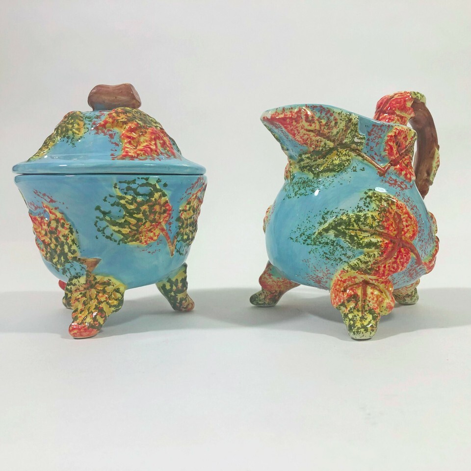 Sugar Bowl with Lid and Creamer Set Blue and Orange Green Leaves Design