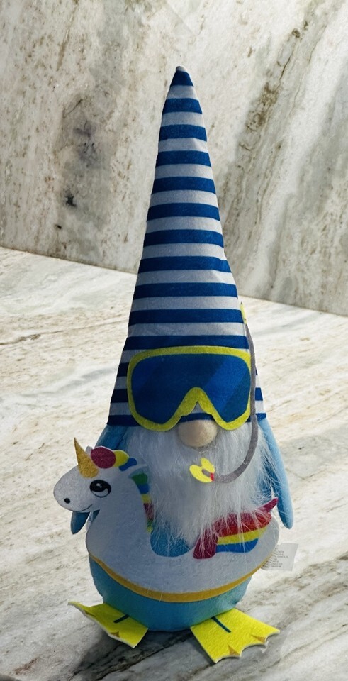 Add a pop of color to your summer decor with this decorative Snorkel Gonome. Measuring 12 inches tall, this gnomes features a bright multicolor rainbow pattern that will brighten up any room. The 3D effect adds a unique touch, while the antique finish gives it a timeless feel. Perfect for those who love the beach and summer, this gnome is sure to make a statement in any space. The fabric material and striped hat make it a great addition to your seasonal collection. Get yours now and add a touch of advertising theme to your holiday and seasonal wall decor. ShipN24Hours. Inventory Location MW997