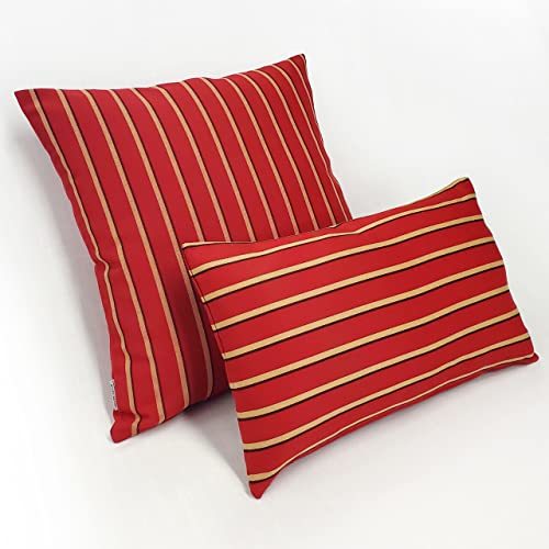 Product description: Elevate your outdoor decor with this 12x19 rectangular throw pillow made from Sunbrella Harwood Crimson fabric. The bold stripe pattern in shades of red, tan, and black adds a classic touch to your patio or deck. Resistant to stains, pilling, and abrasion, this durable pillow will last season after season. Coordinates perfectly with our Jockey Red outdoor pillows. These high-quality outdoor pillows will enhance any outdoor living space!