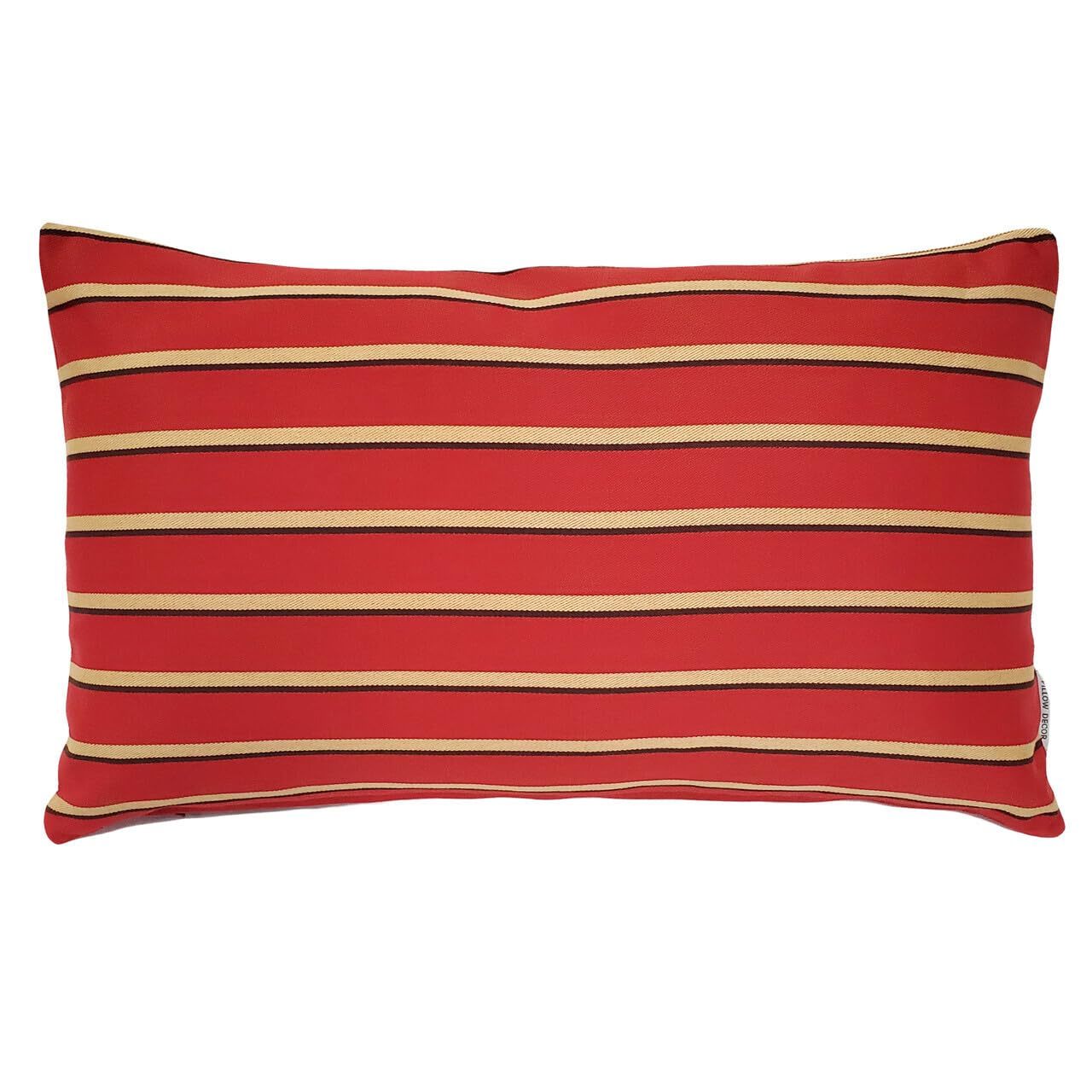 Elevate your outdoor decor with this 12x19 rectangular throw pillow made from Sunbrella Harwood Crimson fabric. The bold stripe pattern in shades of red, tan, and black adds a classic touch to your patio or deck. Resistant to stains, pilling, and abrasion, this durable pillow will last season after season. Coordinates perfectly with our Jockey Red outdoor pillows. These high-quality outdoor pillows will enhance any outdoor living space!