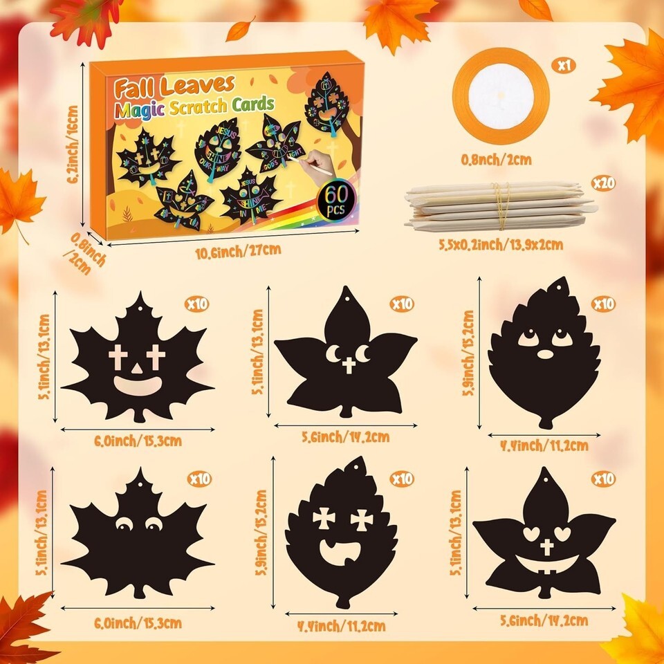 Complete Maple Leaf Scratch Set: This exquisite fall-themed kit contains 60 cards in 6 delightful styles, 20 wooden styluses for easy scratching, and elegant orange ribbon for gifting.