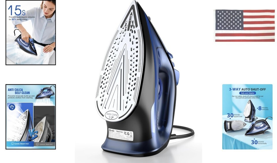 - Sundu 1500W Ceramic-Coated Steam Iron for Clothes with Rapid Heating, Self-Cl...