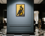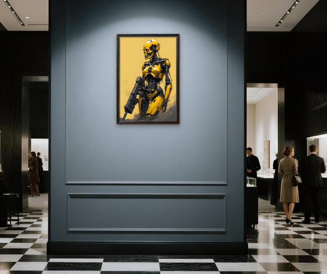Clutched in its hand is a massive, industrial-grade rifle—heavy, mechanical, and engineered for planetary conflict. Despite the mechanical brutality of its body, the android’s stance is almost human, blending raw military engineering with eerie, lifelike posture. The bright yellow armor contrasts sharply against the muted background, making the machine look like a lethal beacon marching out of a ruined future.