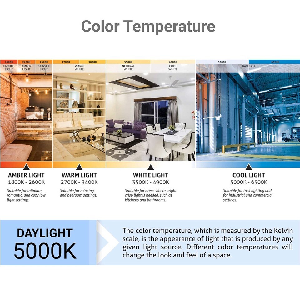 DAYLIGHT COLOR TEMPERATURE - At 5000K these bulbs put off a daylight. Ideal for utility rooms, work spaces, reading areas, or any place bright, clean lighting is required. Rendering Index (CRI) of 80 and a 220 degree beam angle