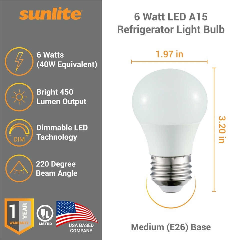 - Sunlite LED A15 Refrigerator Bulb 6W 450 Lumens E26 Dimmable Frosted 5000K 1Pack