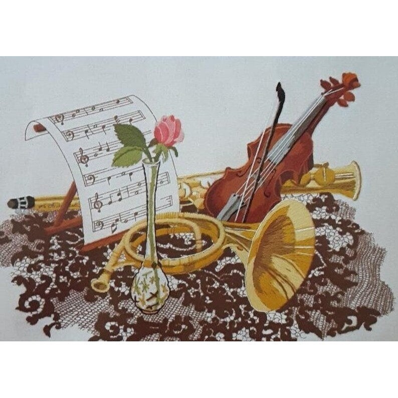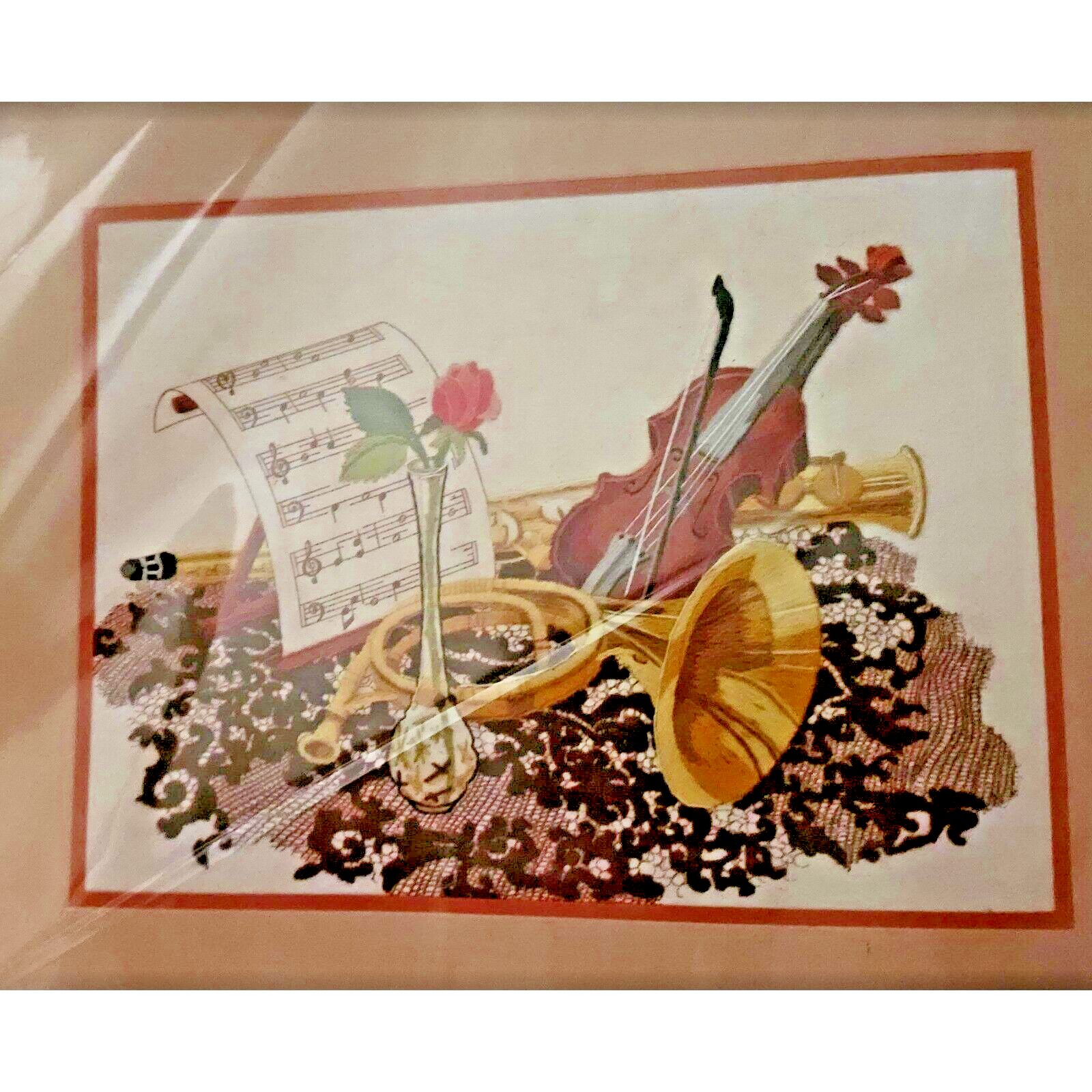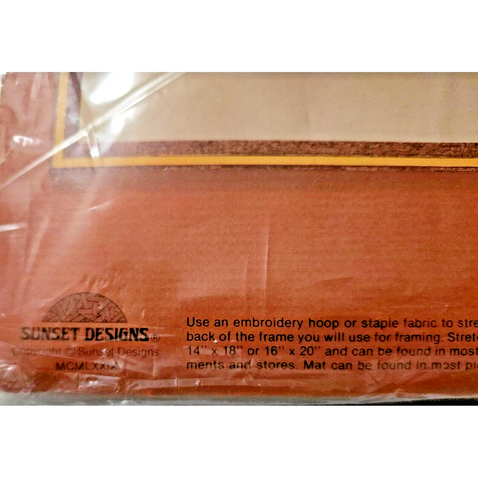 Sunset Stitchery Afternoon Recital 1979 Kit #2202 Fits 14" x 18" Frame without Mat. Fits 16" x 20" Frame With Mat Designed by Nancy Rossi. Kit Contains Printed Design on 20" x 24" 50% Polyester/50% Cotton Fabric 100% Wool Yarn and 100% Cotton Yarn sufficient to Complete the Design. Needle, Full Color Print Complete Instructions. New Old Stock