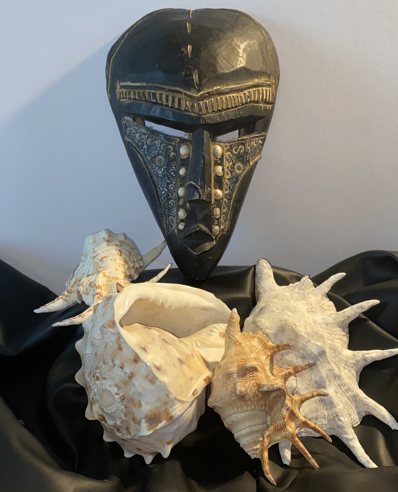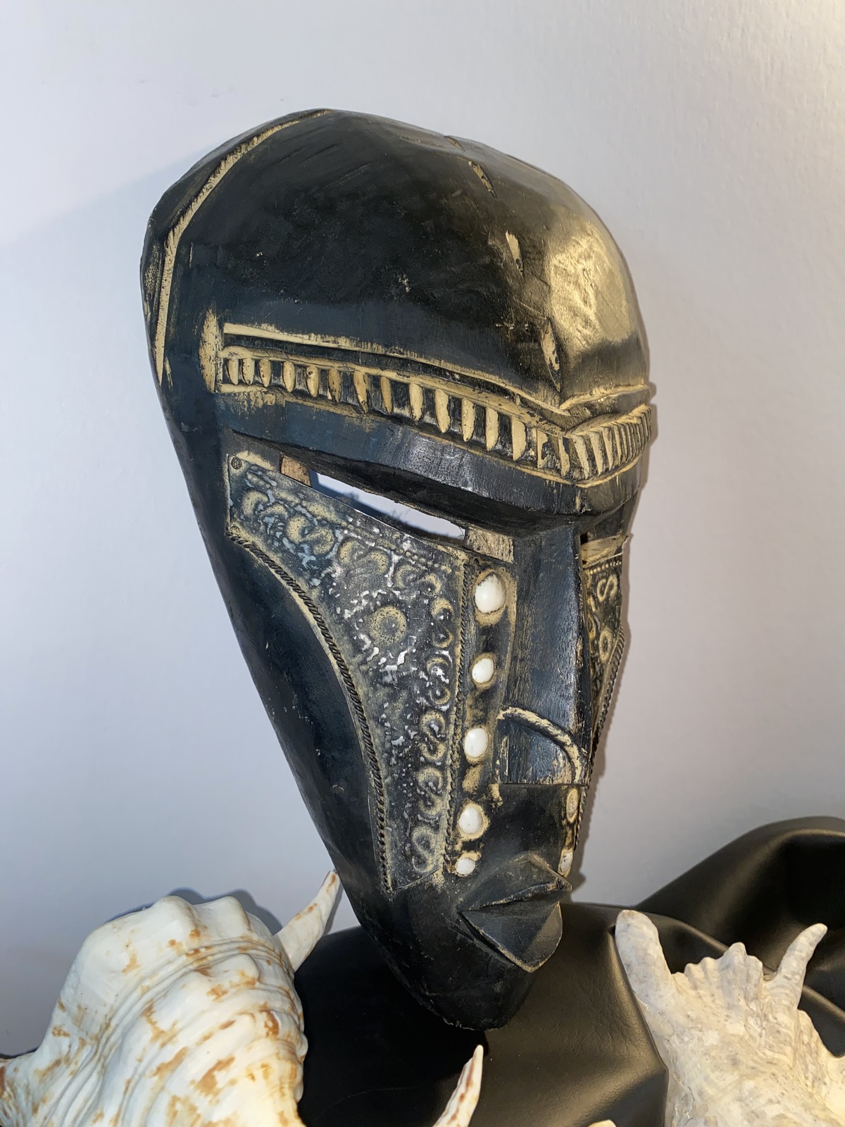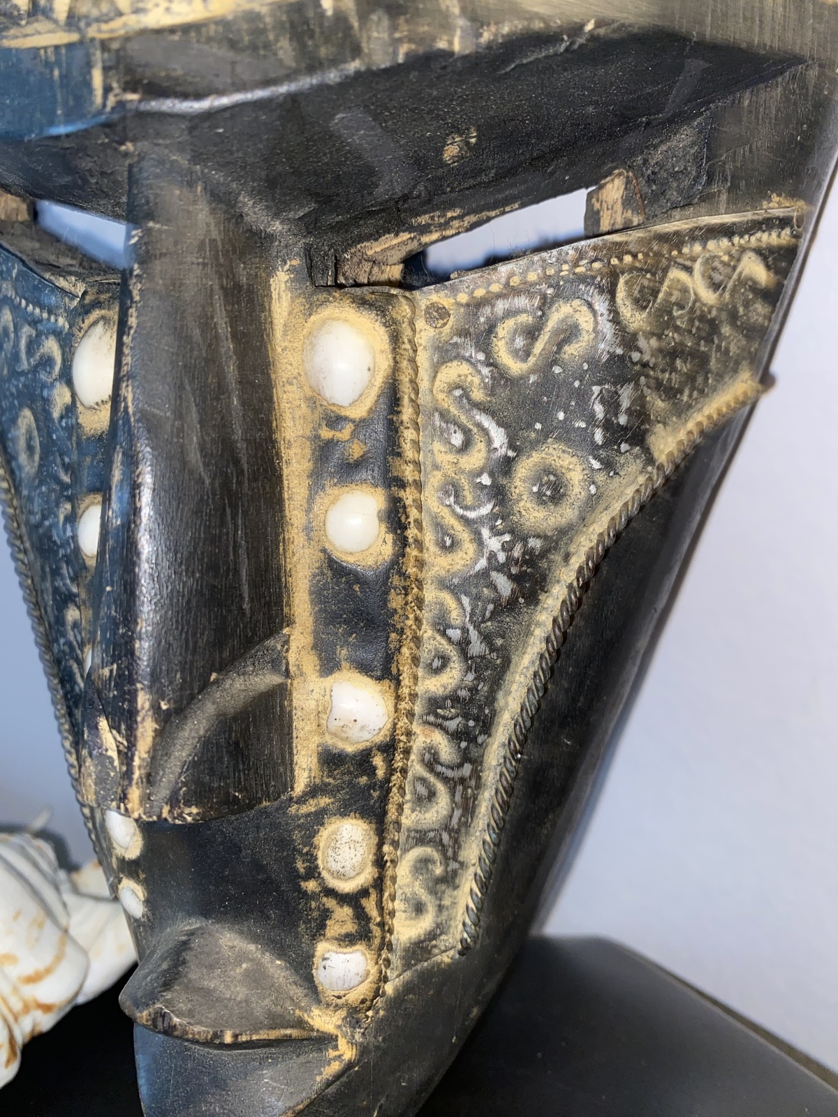 This listing features a very old hand carved Ghana tribal art mask. Our guess for it's age would be the 1960's or 1970's as it's far more crudely carved and adorned than later more refined carvings. We love it's exotic shape and sharp expressions in it's nose and lips. The shells seen are for presentation purposes and are not included in the sale of this mask.