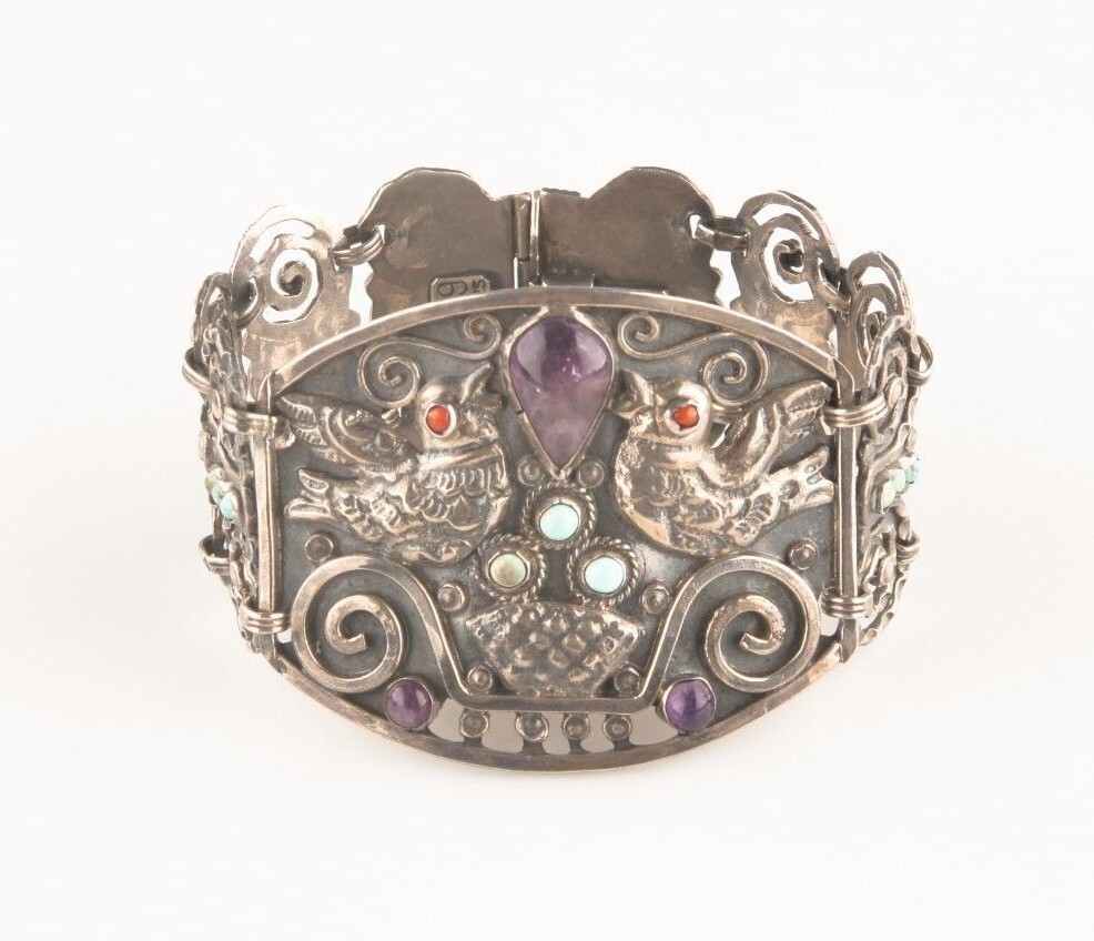 Ce bel ensemble de bijoux complexe artisanal est decore d'amethyste et de turquoise. Le bracelet est orne de deux Palomas de repousse (colombes) aux yeux de corail. Ces pieces sont de Mexico et sont en excellent etat vintage!