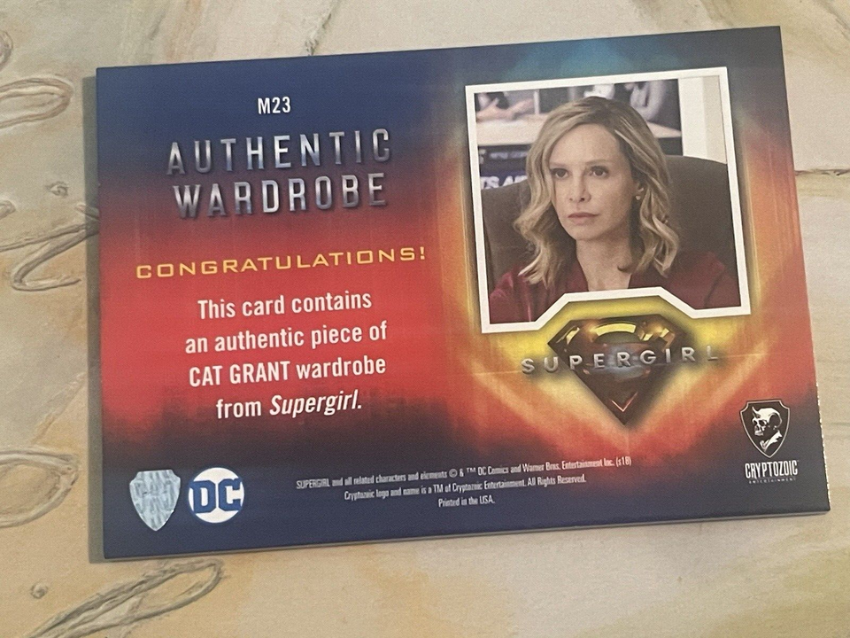 This Supergirl season 1 wardrobe card features Calista Flockhart as Cat Grant. The card is made of high-quality card stock and is a standard size for easy display. It was manufactured by Cryptozoic in 2018 and is part of the Supergirl franchise. The card showcases Flockhart's character and is perfect for collectors who are fans of the TV show. The card is in English and is suitable for ages 8 and up. It is a non-sport trading card and is categorized under Trading Card Singles, Non-Sport Trading Cards, and Collectibles. The card is not vintage and was manufactured in Jordan.