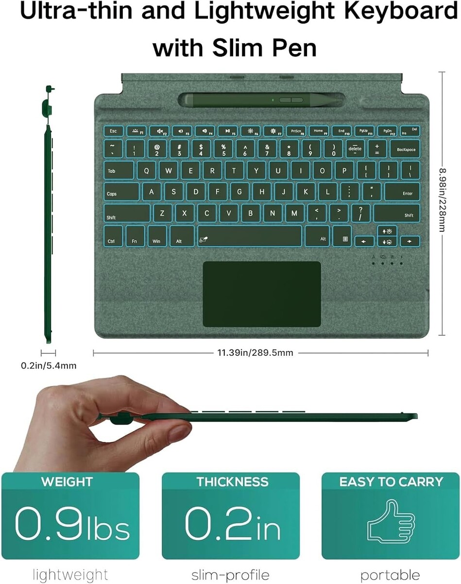 Natural On-Screen Writing Superior Typing Experience: Slim pen delivers fast and accurate typing like a traditional, full-size keyboard.The surface pro keyboard has 7-color backlight options with 3 brightness levels to enhance better visibility;Keyboard shortcuts and stable scissors keycaps allow fast, fluid and quite typing.