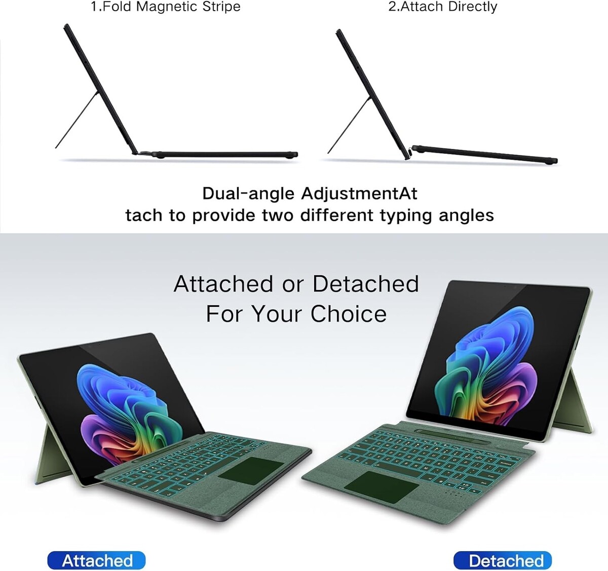 Magnetic Attachment Stable Bluetooth Connection: The strong magnetic strip ensures a secure connection.You can freely choose to use this surface pro keyboard in adsorbed or detached states. Our surface pro keyboard has a bluetooth range of up to 10 meters (33ft) and support for Bluetooth Swift Pair. Your device will pop out a notification for pairing when the bluetooth in on.