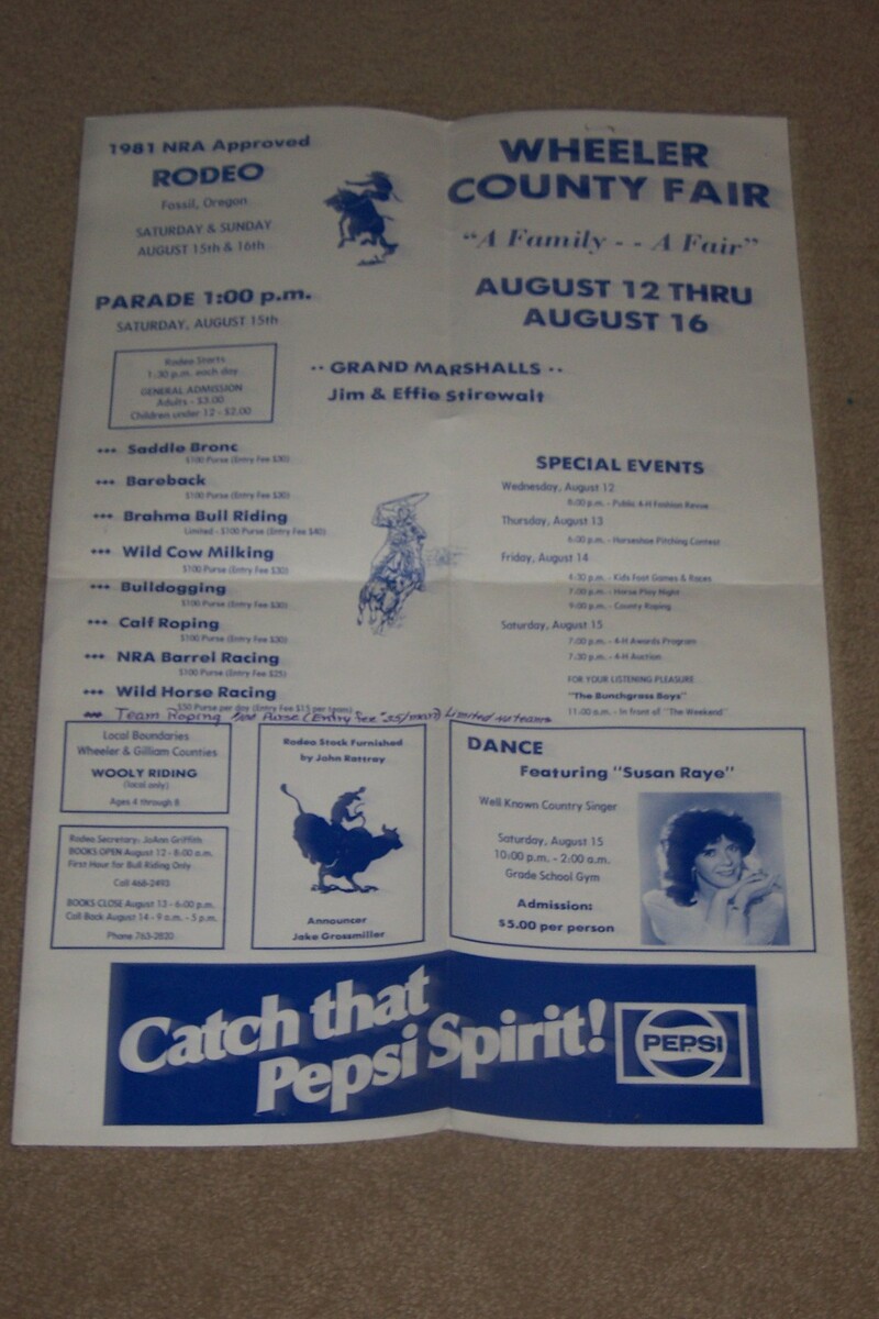 This is a poster advertising the 1981 Wheeler County Fair and Rodeo in Fossil, Oregon, featuring Susan Raye. The poster was folded, stapled and mailed, so there are creases and postmarks/addresses on the backside. Still would frame and display nicely.