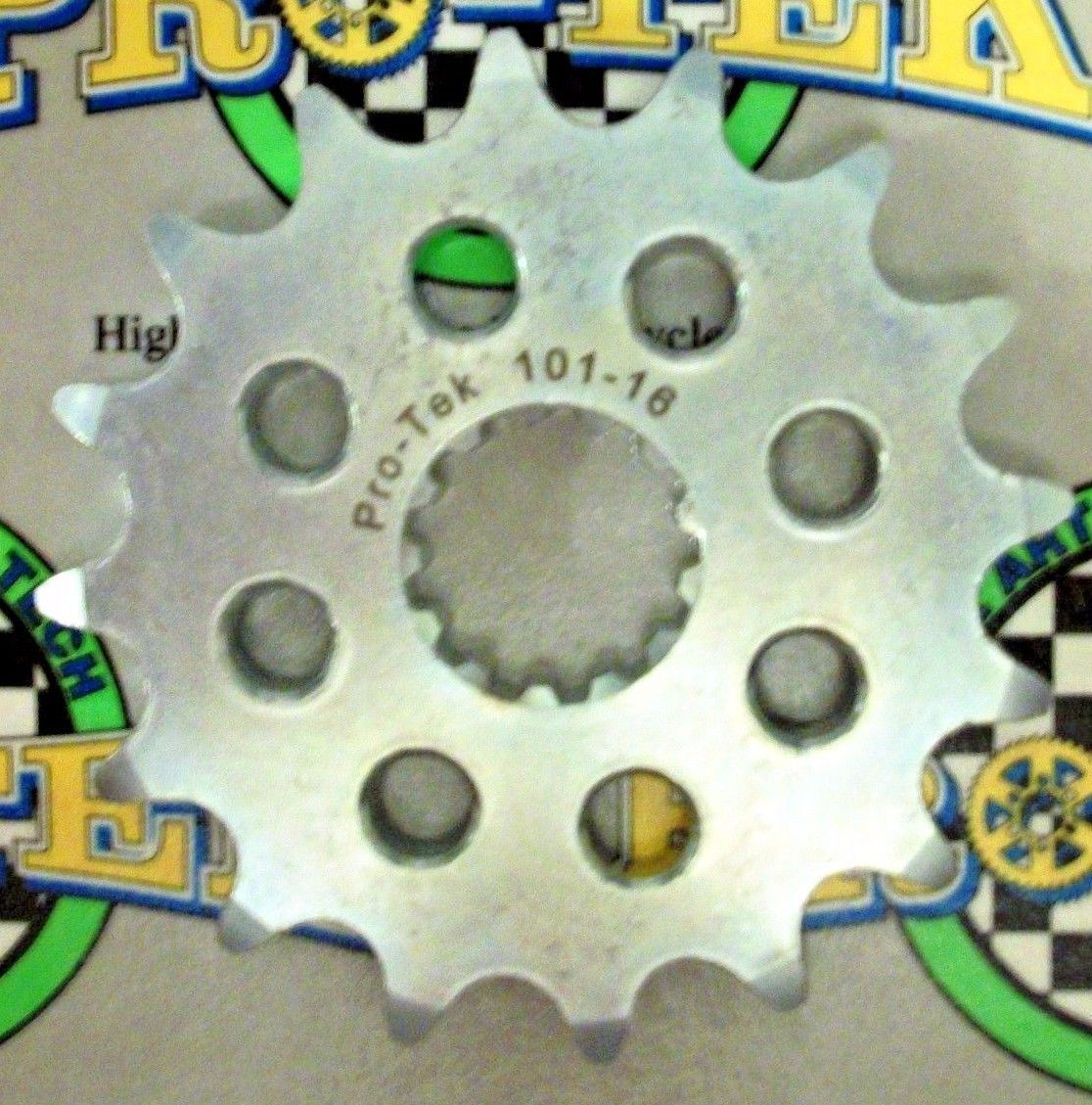Pro-tek front sprockets are completely CNC machined to exact tolerances from 4140 nickel-chromoly steel resulting in a quality product. None of the Pro-tek front sprockets are gear hobbed, but are lightened with drilled holes to save on rotating mass. Every lb of rotating mass equates to a 4 lb weight reduction. The sprockets are then case hardened to Rc 58-60 and finished with a zinc plating for added durability and protection from corrosion. Made in the USA, normally retail for $34.95. This is for a 530 Pitch front sprocket 13, 14, 15, 16, 17 or 18 tooth.
