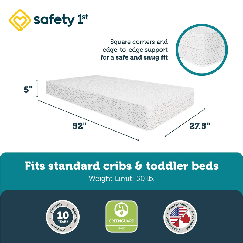 Made with an ultra firm high-density thermo-bonded polyester core that is lightweight and durable and a 100% vinyl outer cover that is waterproof and stain resistant to wipe clean instantly. Square corners ensure snug fit in crib and toddler beds. Safety 1st has received the 2019 Women's Choice Award(r)? as an America's Most Recommended(tm) brand for Crib Toddler Mattress The baby mattress has achieved GREENGUARD Gold Certification. GREENGUARD Certified products are certified to GREENGUARD standards for low chemical emissions into indoor air during product usage Shipped in a bag. Assembled in Canada, made of imported textiles. 10-year limited warranty. Fits standard size cribs and toddler beds with internal measurements of 28a in. X 53 in. Made without the use of flame retardant chemicals. Mattress dimensions: 54"L x 27.5"W x 5"H. Weight limit: 50 lbs. Net weight: 7 lbs. Shipping dimensions: 52"L x 28"W x 5"H. Gross weight: 10 lbs. For optimal use, rotate mattress every 2-3 months.