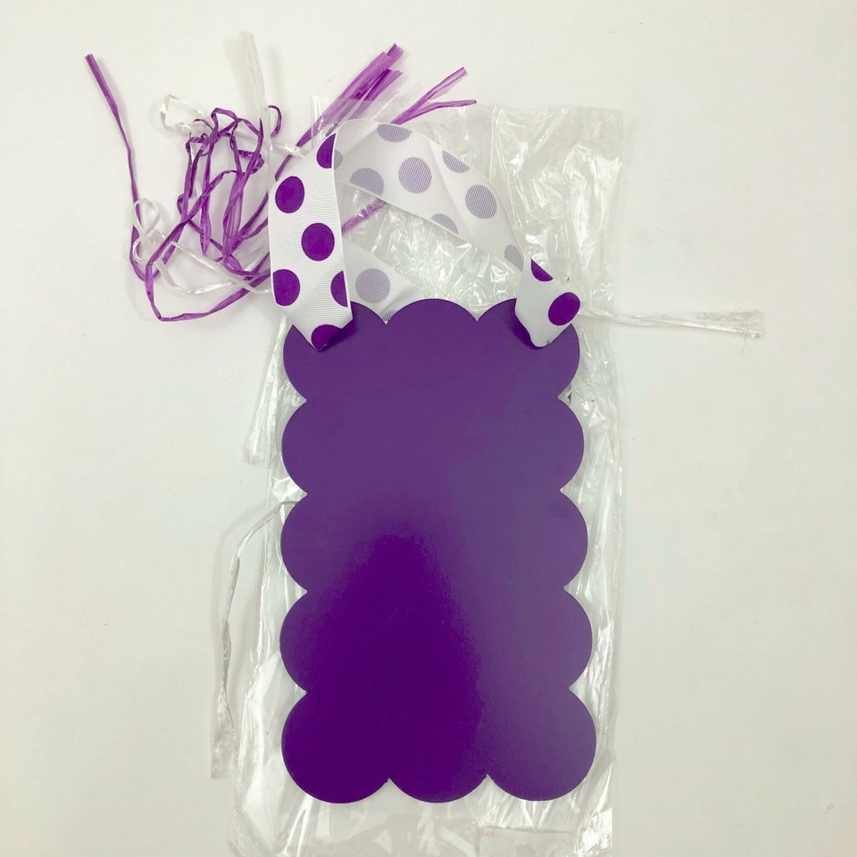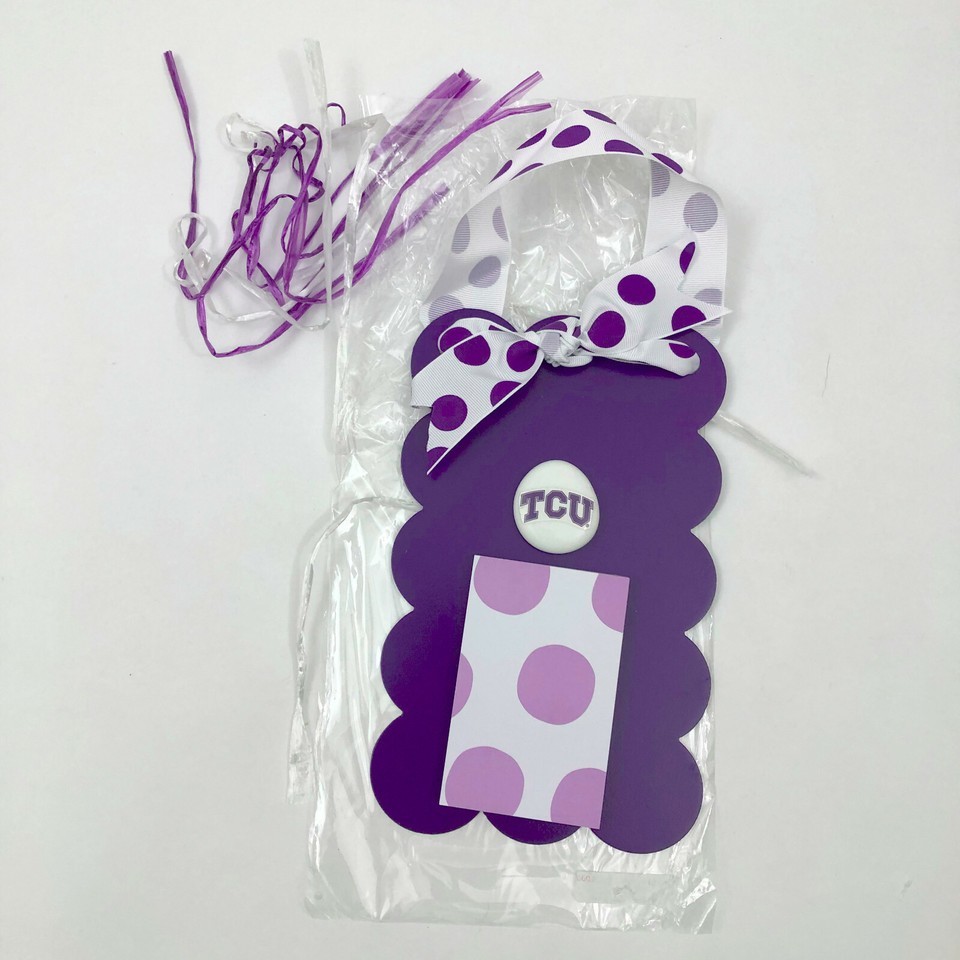 NWOT, New With Out Tags. Fun purple, scalloped edge metal magnetic memo board with a purple white memo note pad and a magnet with the TCU logo. There is a bow in the TCU colors of purple white to hang the board. The memo pad is white with purple polka dots.