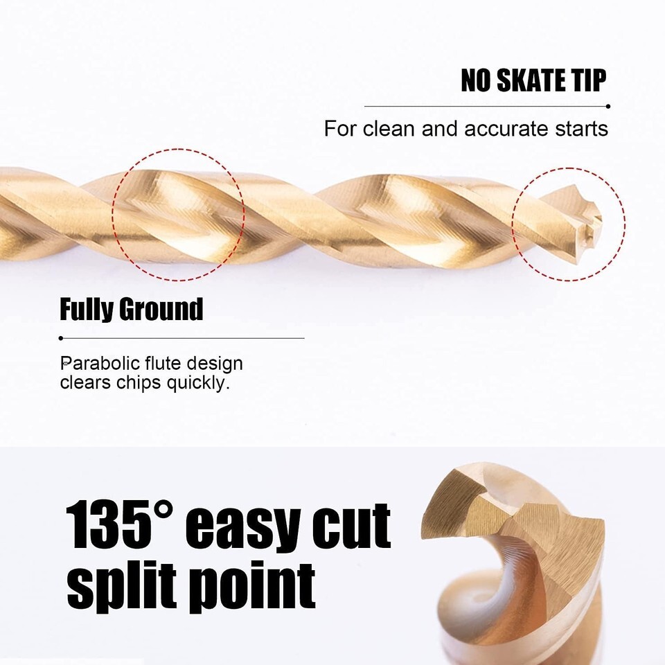 DESIGNED BLADEPOINTThese bits with a 135 split point keep centered without a pilot hole, full-ground body drill faster with fewer defects. excellent chip removal and heat removal;