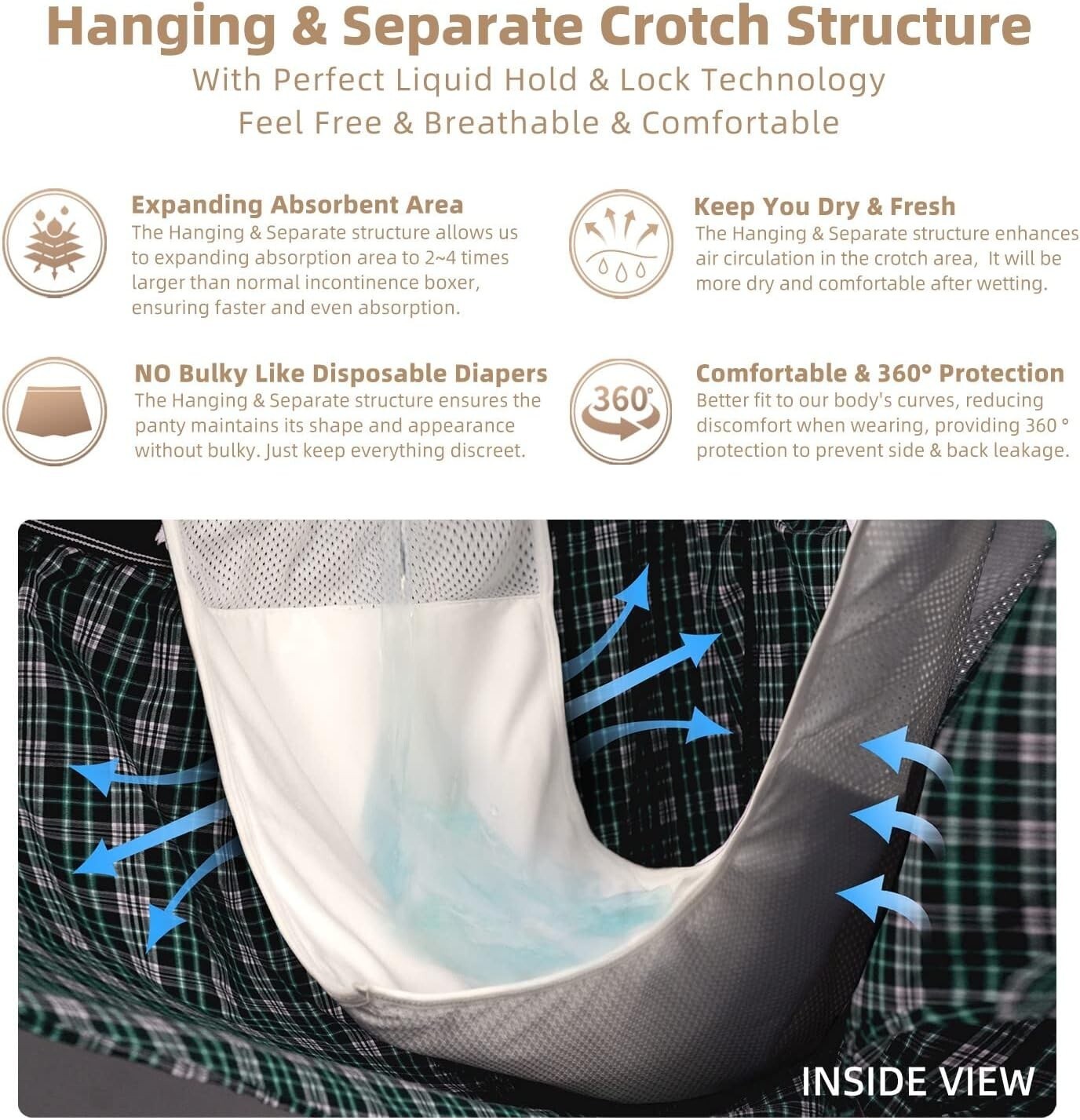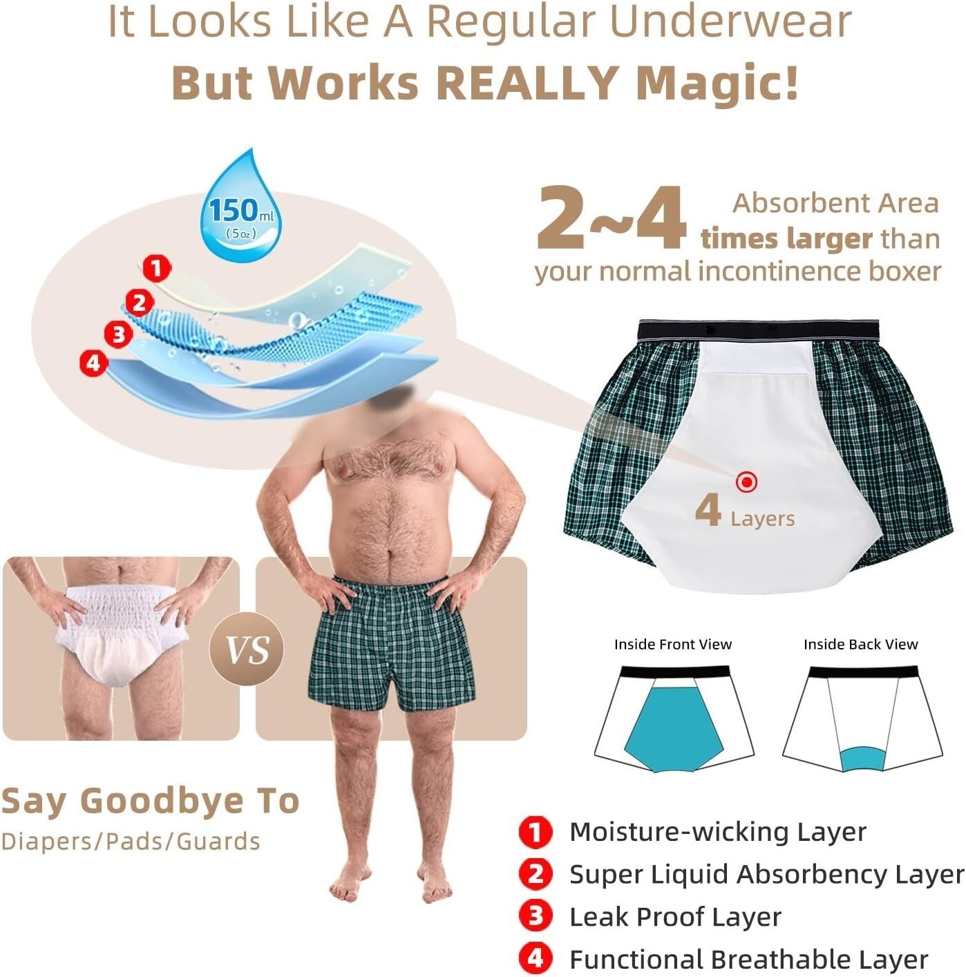 Regain Confidence and Dignity -- Men's incontinence brief looks and feels like regular underwear, you can even freely roam around your home in your plaid boxer briefs. Urinary incontinence boxer brief is designed to prevent prostate problems and accidental leakage in seniors, adults and teenagers. It is suitable for surgery recovery, long distance travel, truck driving and more.