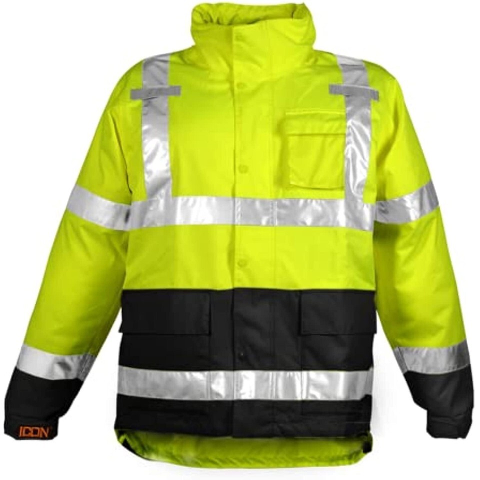 3 Snap Storm Fly Attached Hood Silver Reflective Tape Ansi/Isea 107 Class Jacket Rain Medium Icon Fluorescent Yellow-Green/Black Zipper Front With