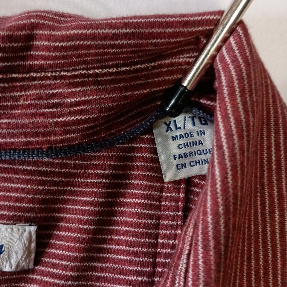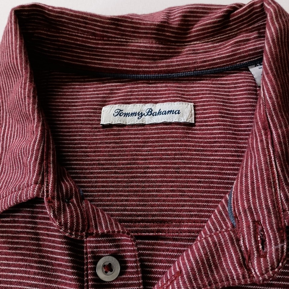 The TOMMY BAHAMA Maroon Polo Shirt is a stylish and versatile piece perfect for men's casual and activewear. With a classic horizontal stripe pattern in maroon color, this short sleeve polo features a collared neckline and pullover closure for easy wear. Ideal for travel or everyday wear, this shirt is easy to care for and showcases the signature Tommy Bahama logo, adding a touch of sophistication to your wardrobe. Made in a size XL, this polo shirt is a comfortable and fashionable choice. Normal wear.