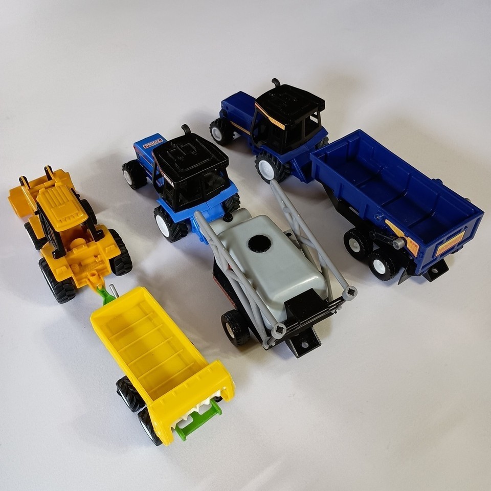 This lot includes a collection of 6 plastic farm toys featuring harvesting equipment, specifically tractors and trailers. The tractors are Ford like brands and are in multi-colors, with a scale of approximately 6 inches in length. These manufacture toys are part of a farming theme and can be used for imaginative play. The set is a mix of Tonka and unbranded tractors. Yellow tractor is friction powered but missing some parts, perfect for any farm equipment enthusiast or collector. Normal wear. See Pictures.