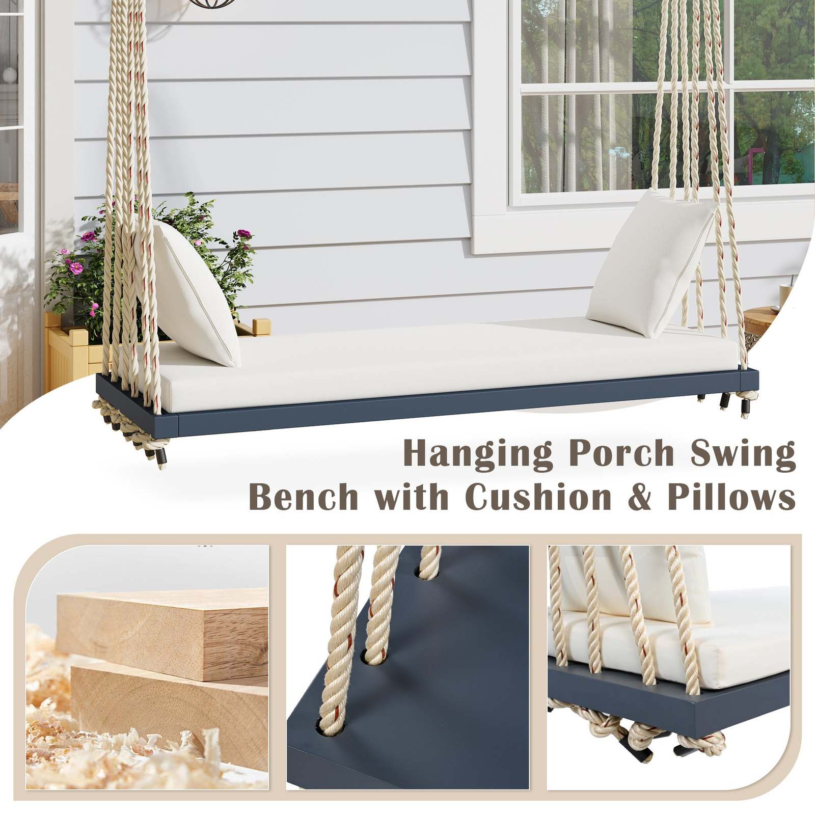 - TOPMAX Wooden Patio Swing Chair: Hanging Porch Bench, Cushions, Ropes, Gray