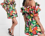 TOPSHOP Women Bold Floral Ruffle Bardot Mini Dress Cotton Blend Multi, Size 8
