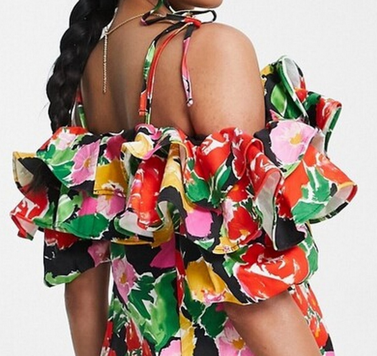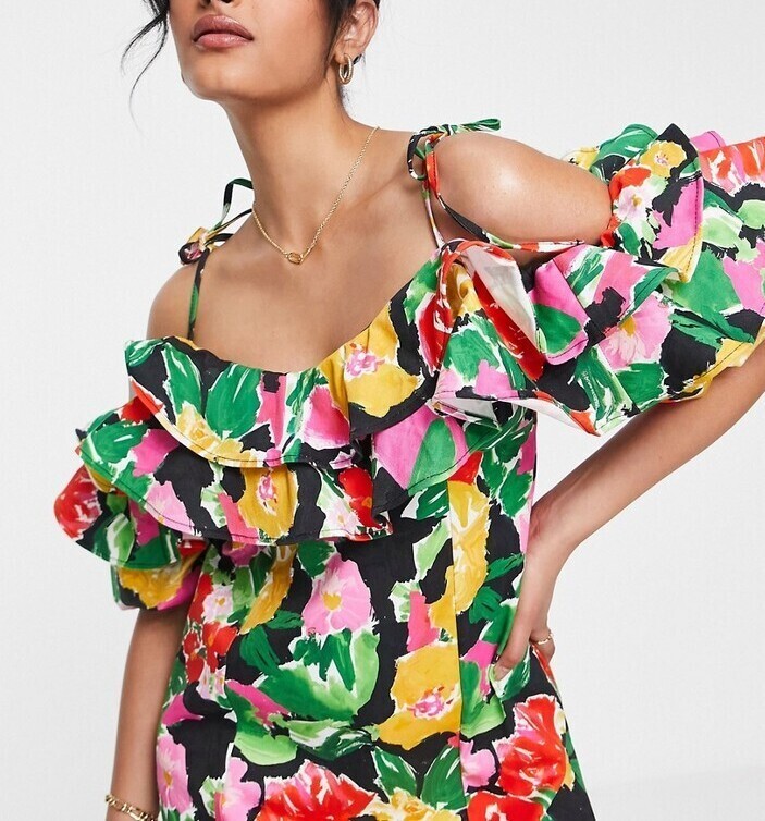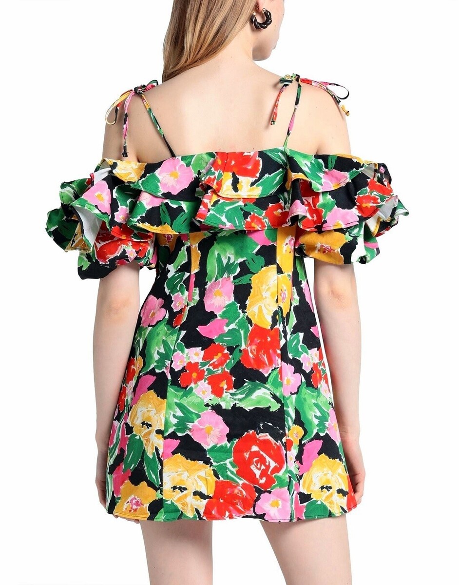 - TOPSHOP Women Bold Floral Ruffle Bardot Mini Dress Cotton Blend Multi, Size 8