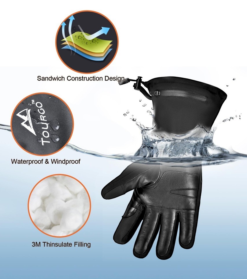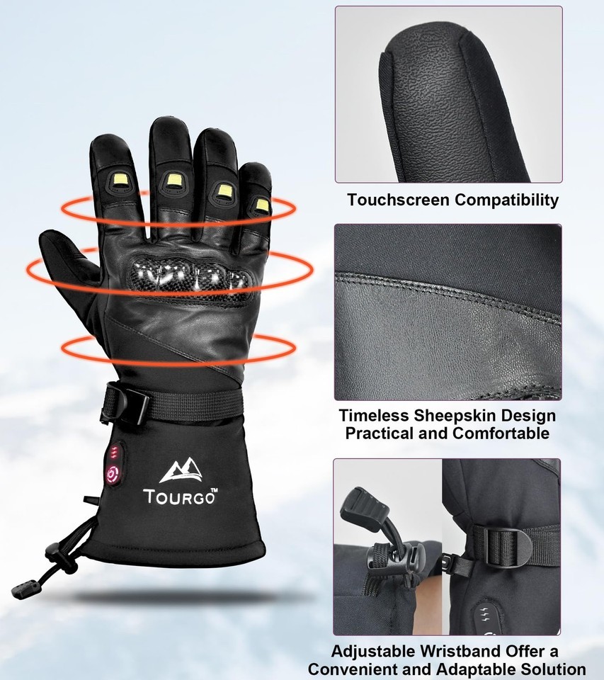 Stay cozy with Waterproof Heated Gloves for cold weather: TOURGO battery heated gloves are lined with high-quality 3M cotton insulation, offering exceptional warmth without the bulk, allowing for easy hand movement and flexibility. They come equipped with touchscreen-compatible fingertips, so you can use your devices without removing your gloves. The combination of high-quality carbon fiber protective shell and genuine leather ensures your hands are not only warm but also well-protected.