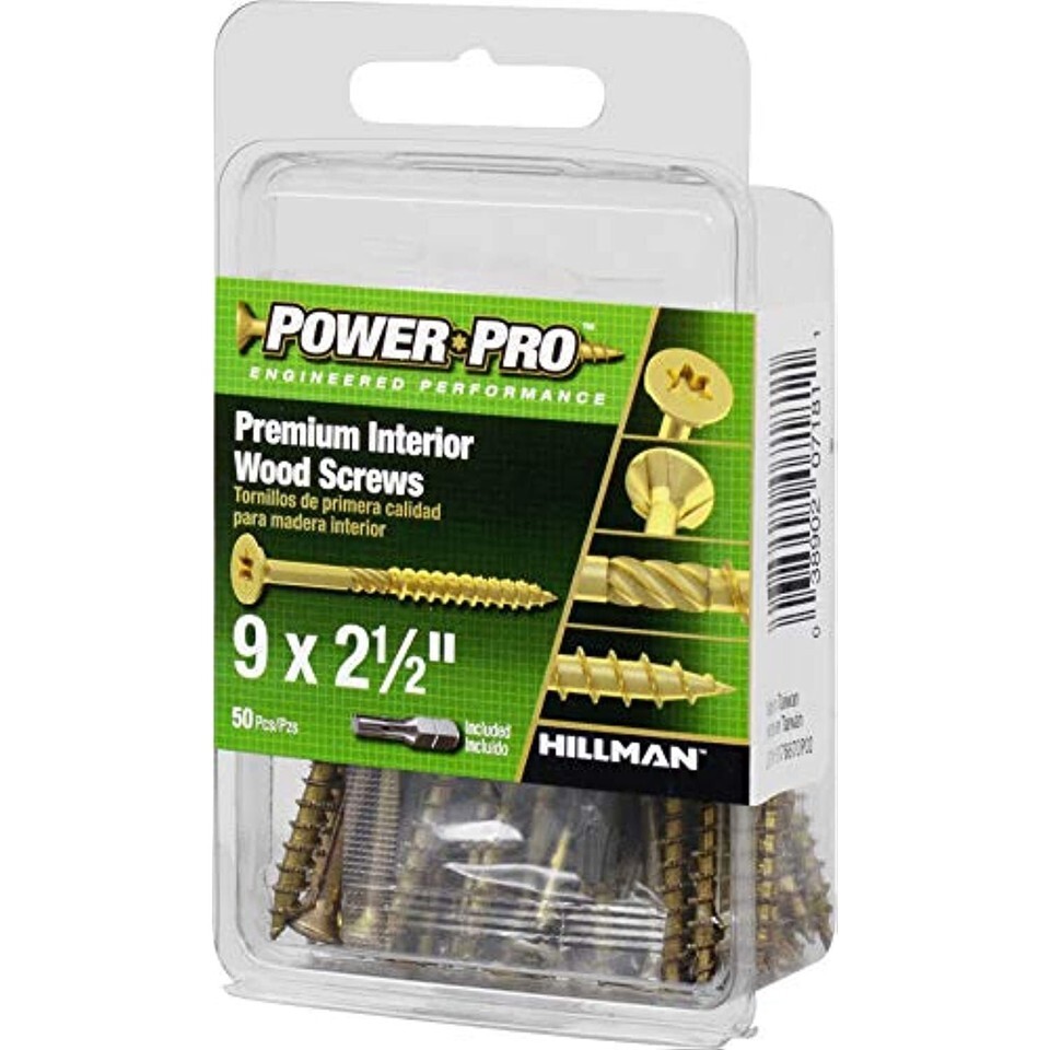 Power Pro, 50 Pack, #9 x 2.5", Yellow Zinc All Purpose Wood Screws, Flat Head With Nibs, Type 17 Point, Special Cross Cut Thread, Star Drive, For Interior Applications.