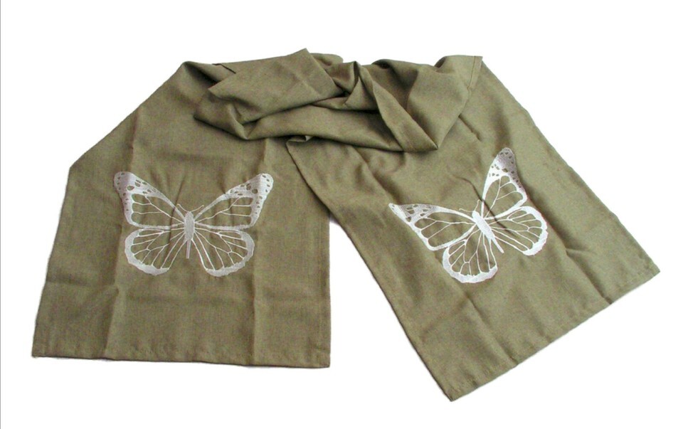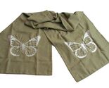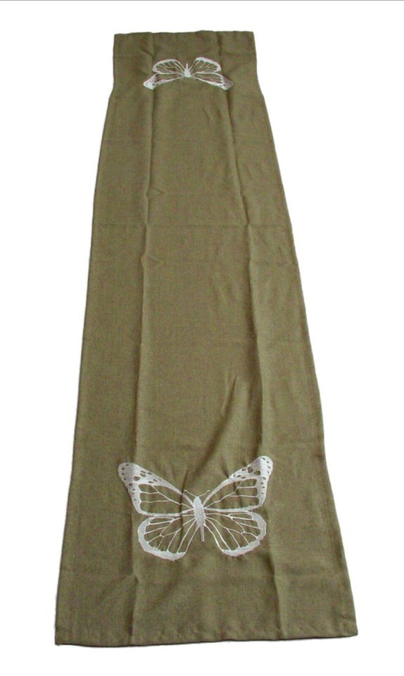 Table Runner, Embroidered White Butterflies at each end on a olive green color background. 100% Polyester, 16x72 inches.