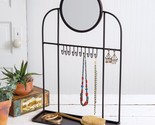 Organize your precious stones with this new ebony jewelry stand. It comes fabricated with a bottom tray and ten tiny hooks for hanging, as well as a mirror on the top.made of metal with a black finish .