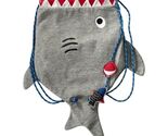 Fun and functional shark-shaped drawstring backpack originally sold at Target. The bag features a gray body with side fins and a tail, a red-and-white ?teeth? top, and blue drawstring cords. Includes a playful fish charm and buoy accent. Perfect for kids, beach trips, or storing toys and accessories.