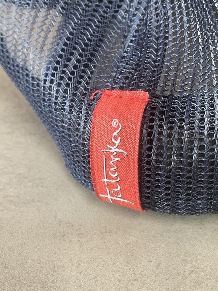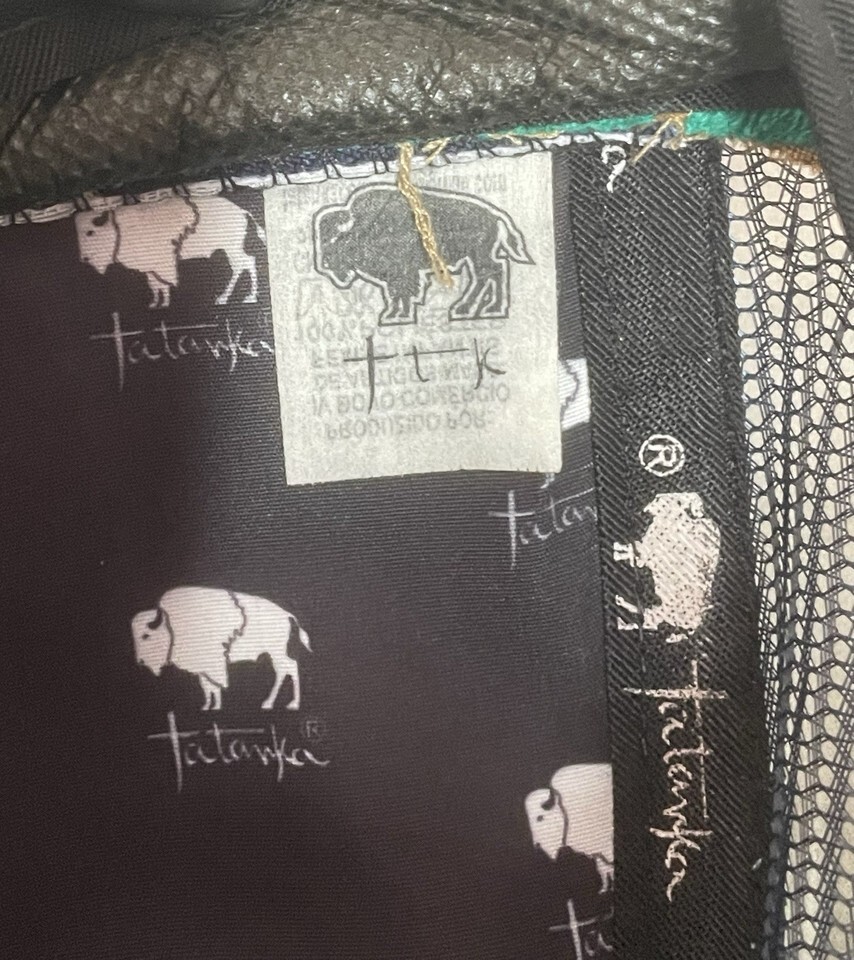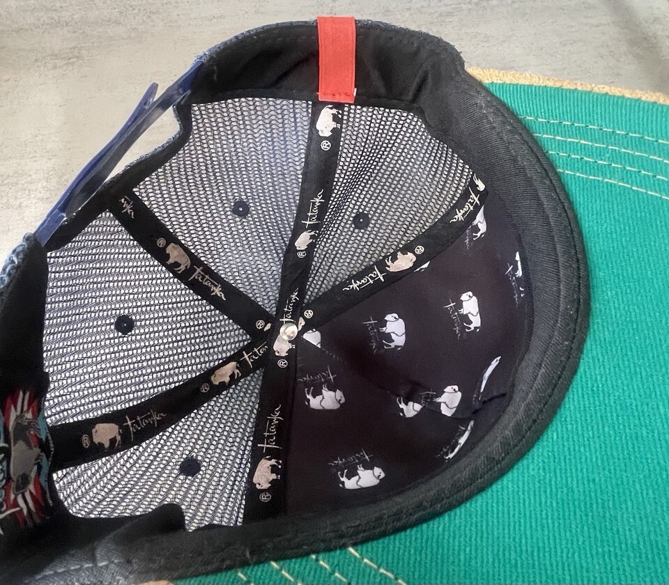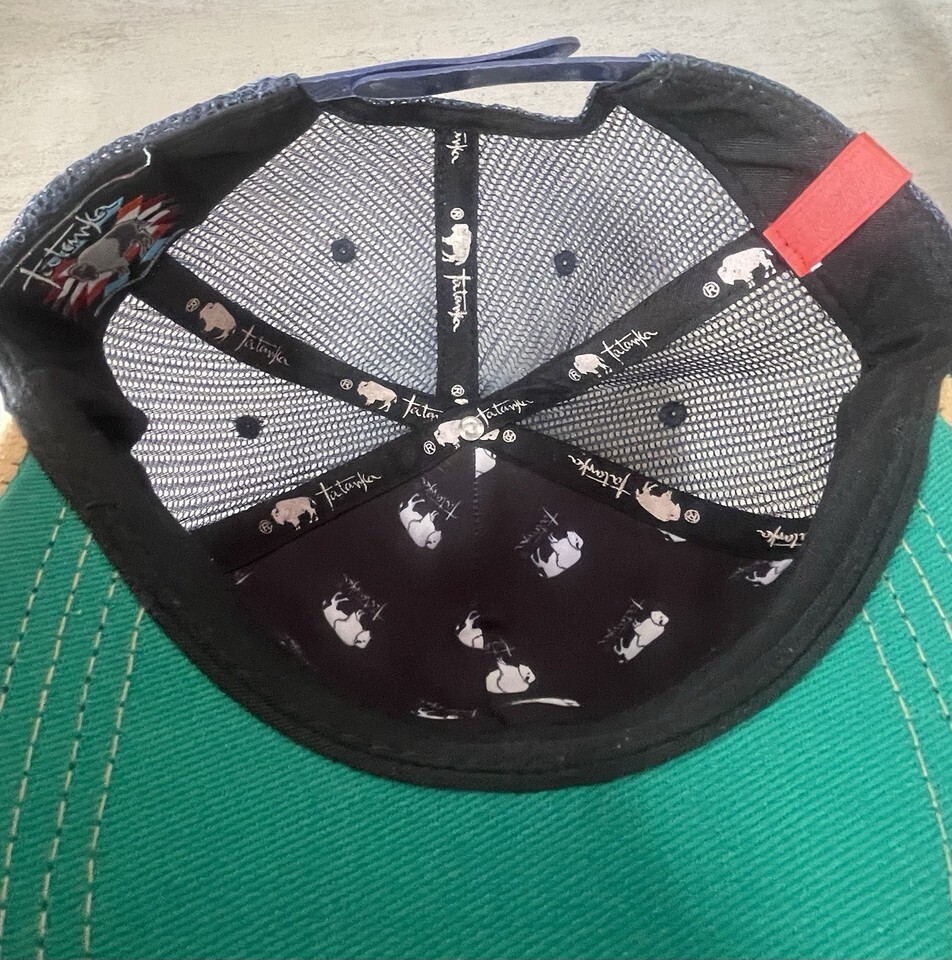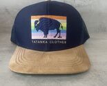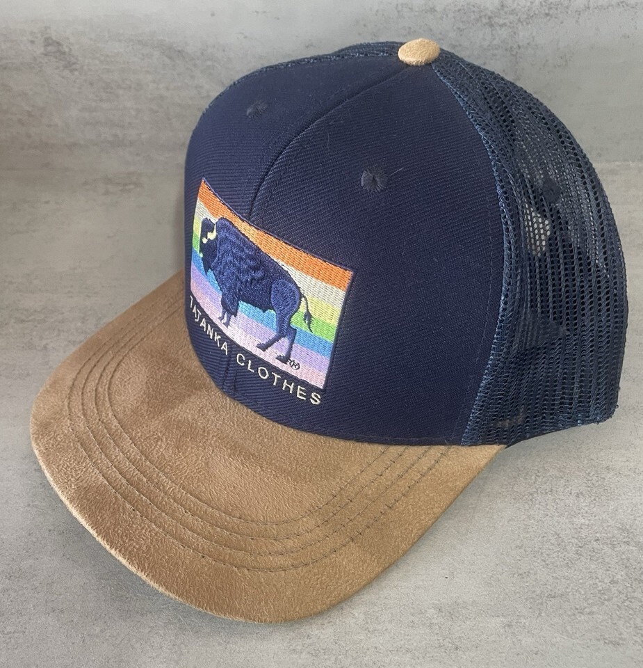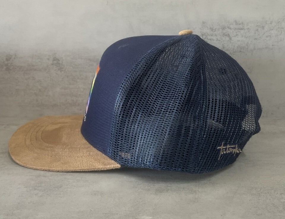 Tatanka Clothes Bison/Buffalo embroidered patch trucker hat with blue mesh back, tan suede-style bill, and snapback adjustable closure. Interior printed buffalo lining and woven brand tag at the back seam. Comfortable and stylish outdoor Western/National Parks-inspired hat.