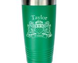Taylor Irish Coat of Arms Travel Tumbler - Green. Bring your drink and your Irish pride with you wherever you go with this beautiful travel mug. We expertly laser your very own authentic Irish coat of arms and surname into the mug's side to reveal it's design in stainless steel. With each mugs vacuum insulation, your beverage will stay cooler or hotter longer. Comes with a removable lid with closing latch. Over 1000 available Irish coat of arms names.